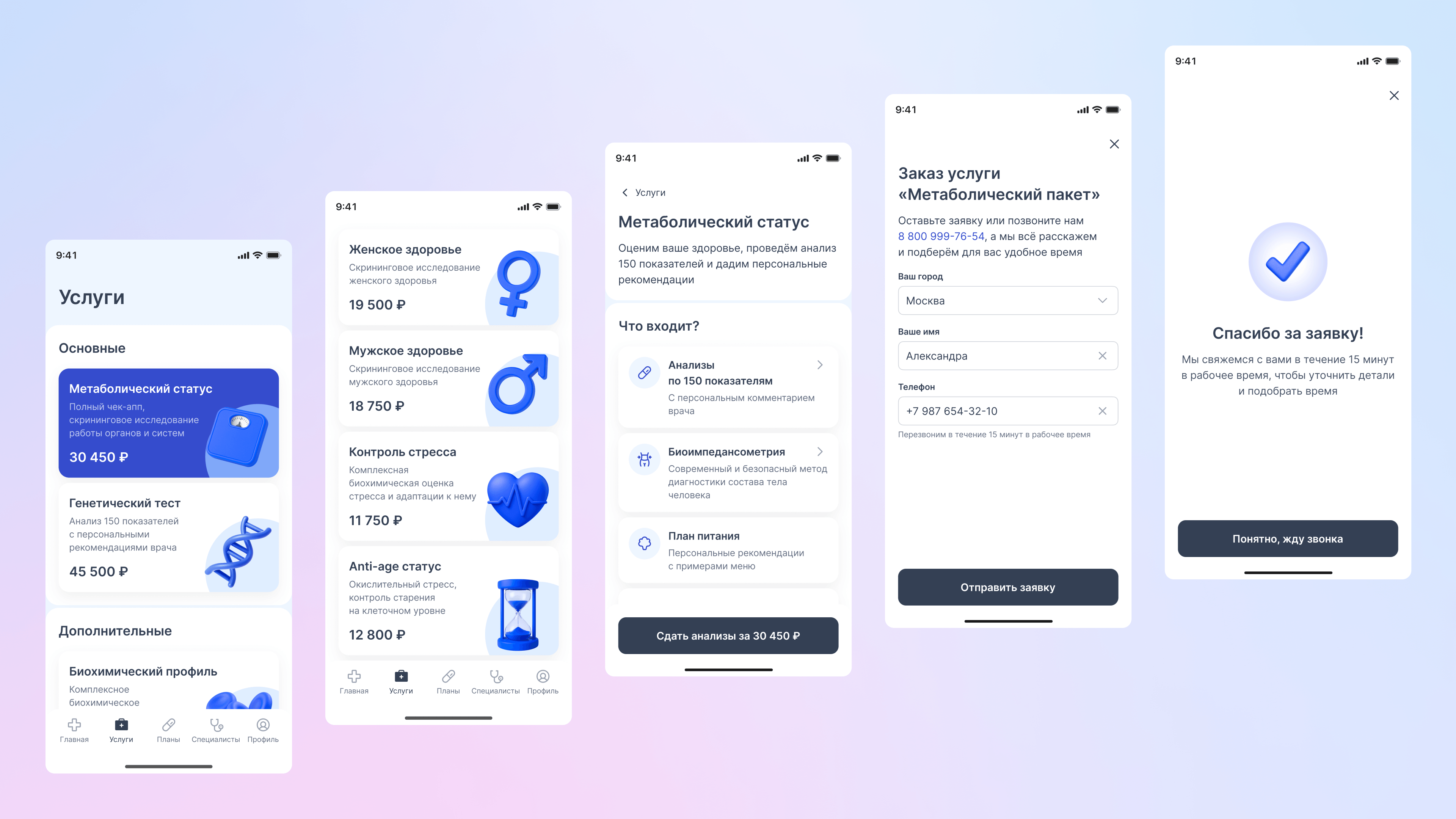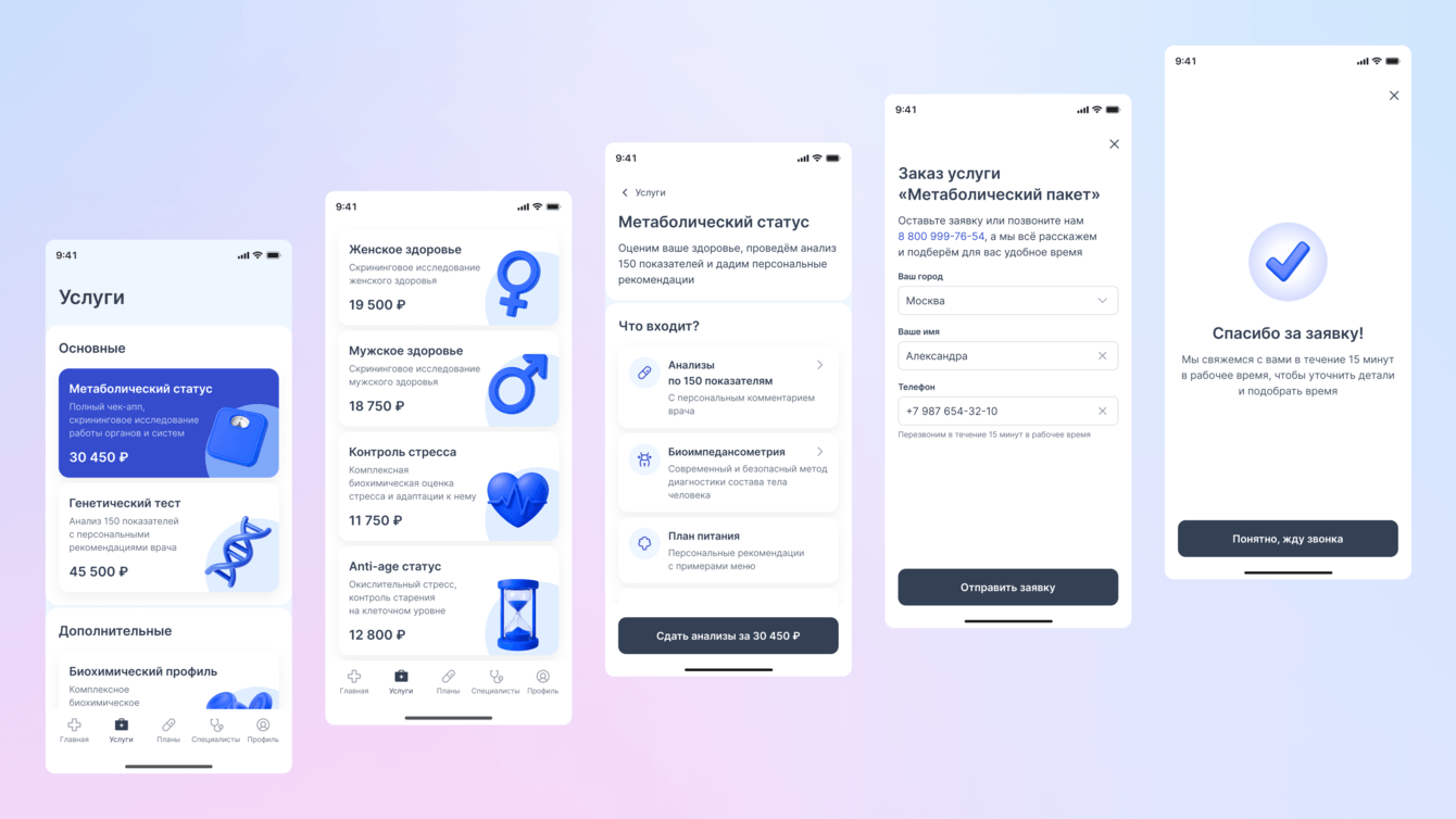 Первое взаимодействие начинается с онбординга и регистрации по SMS-коду. После этого пользователь может ознакомиться с услугами и записаться на чек-ап.