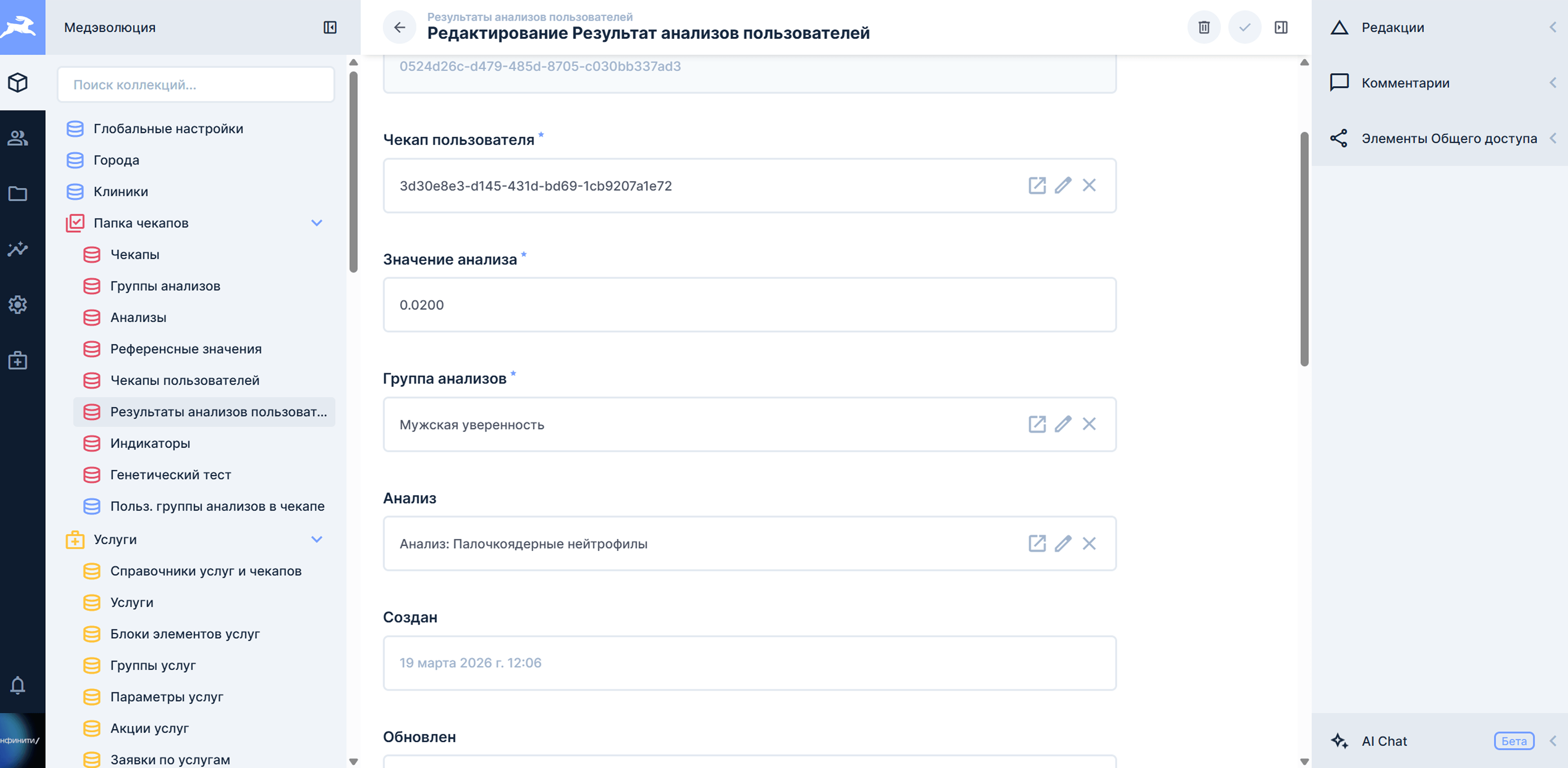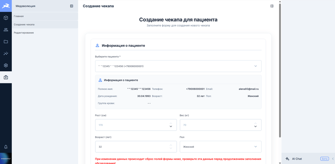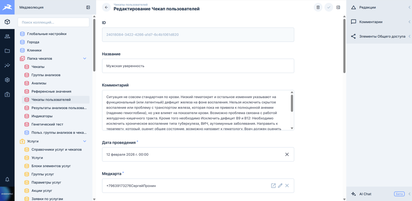 Дополнительно реализована административная панель, через которую врачи и сотрудники клиники управляют данными пациентов и формируют рекомендации