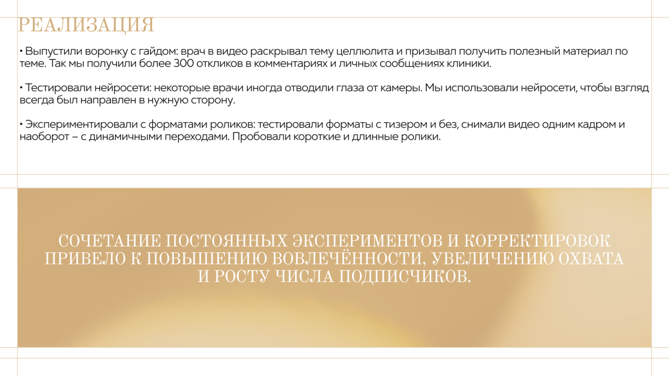 • Выпустили воронку с гайдом: врач в видео раскрывал тему целлюлита и призывал получить полезный материал по теме. Так мы получили более 300 откликов в комментариях и личных сообщениях клиники.