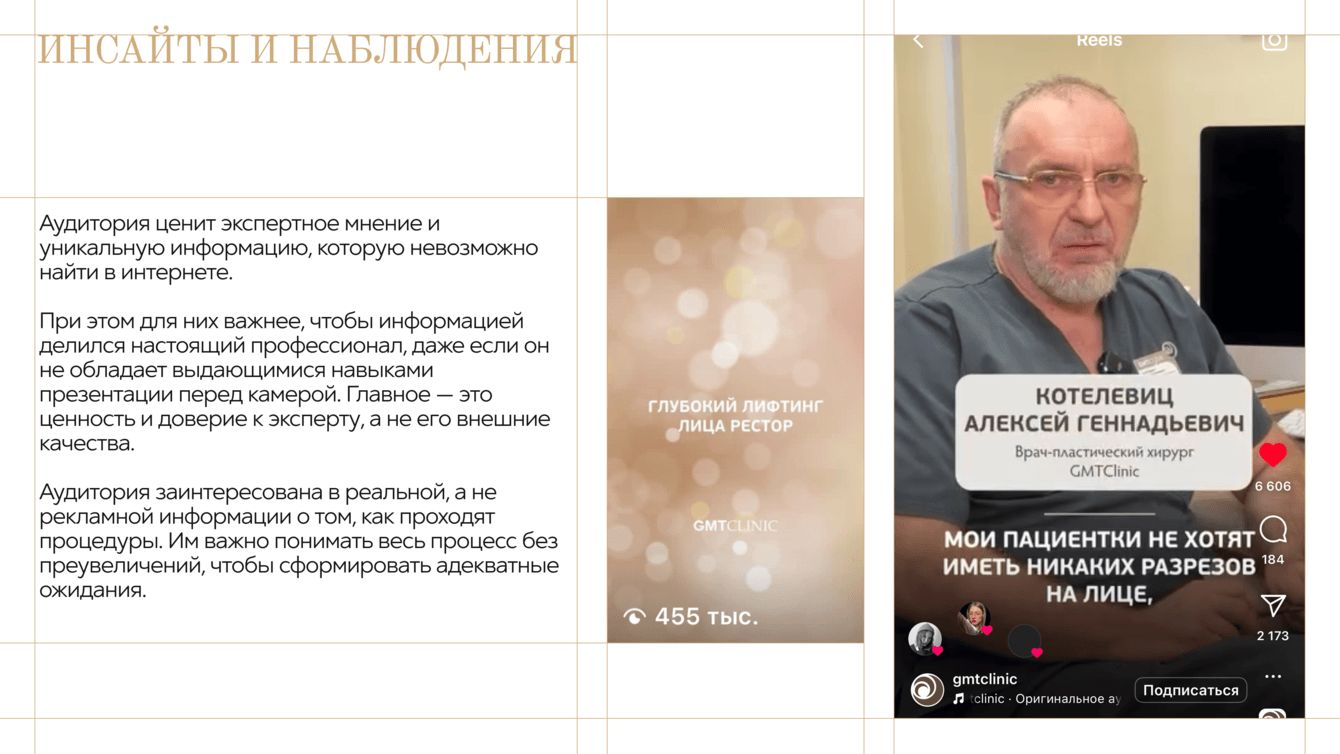• Экспериментировали с длиной роликов: просили врачей не представляться в видео, а затем выводили их имена в виде плашки при монтаже. Так удавалось сделать Reels короче, чтобы он сразу начинался с важной темы и информации. Такие ролики набирали больше охватов.