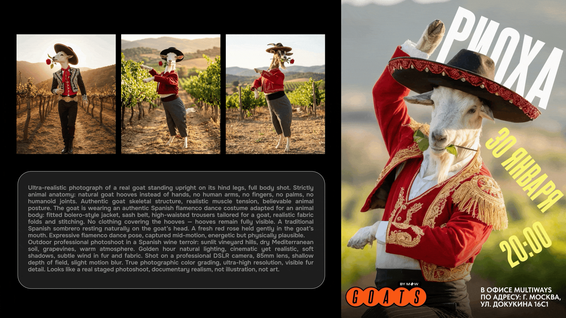 ИИ внутри этой системы использовался как рабочий инструмент: с его помощью мы генерировали иллюстрации, фотореалистичные образы и отдельные визуальные элементы для афиш, анонсов, презентаций, мерча и сопроводительных материалов. В работе мы чаще всего использовали Nano Banana Pro.