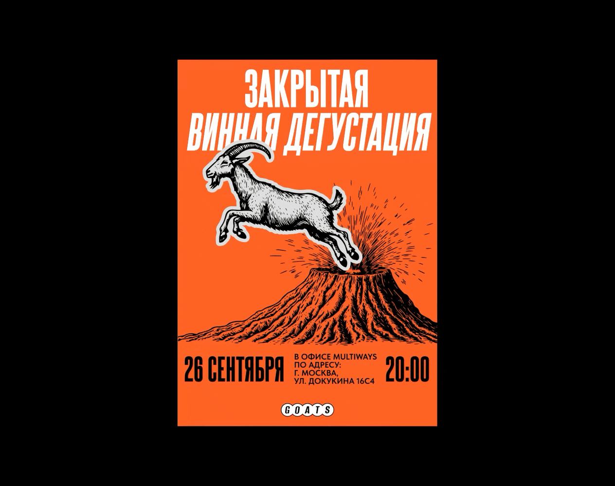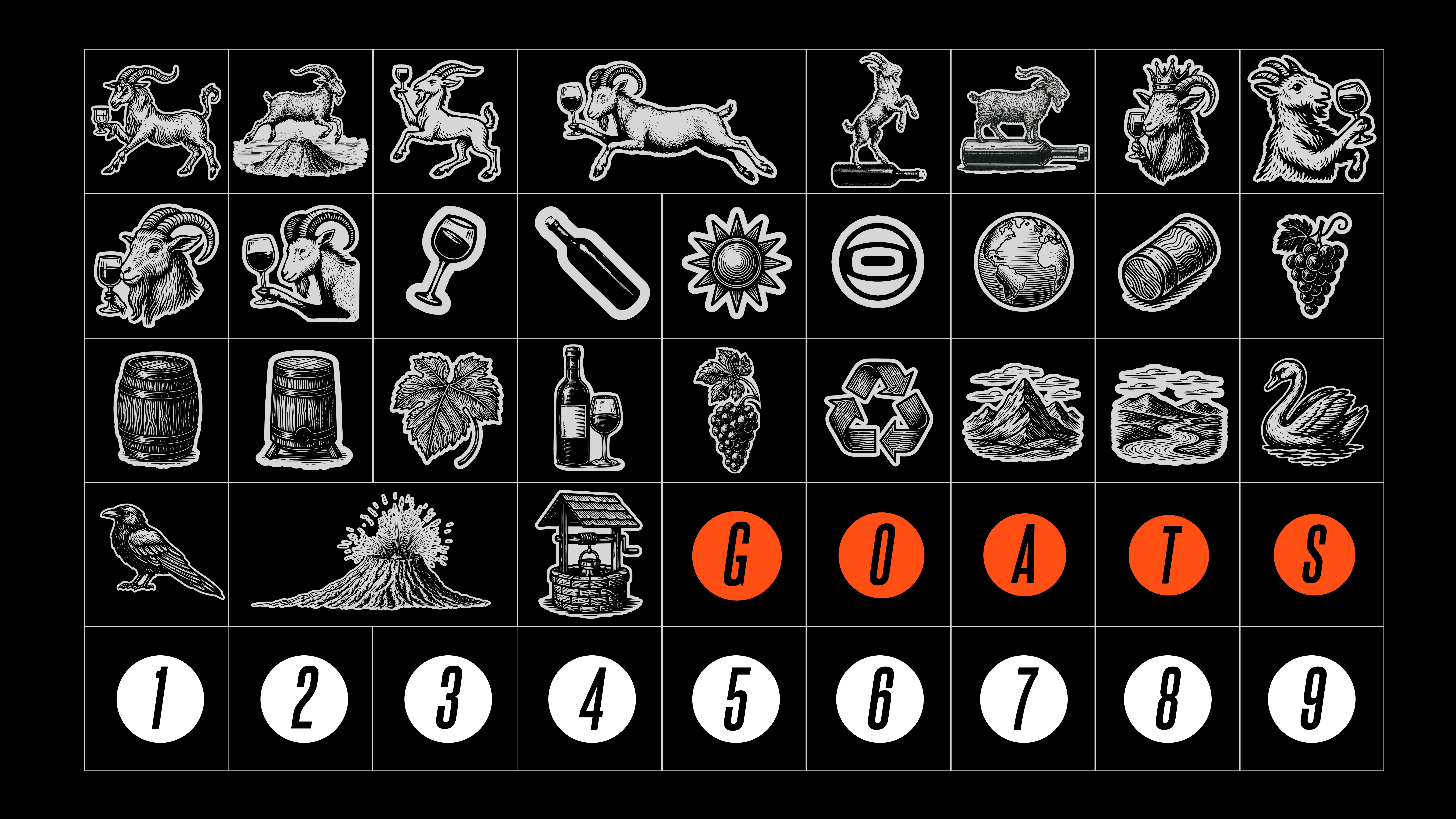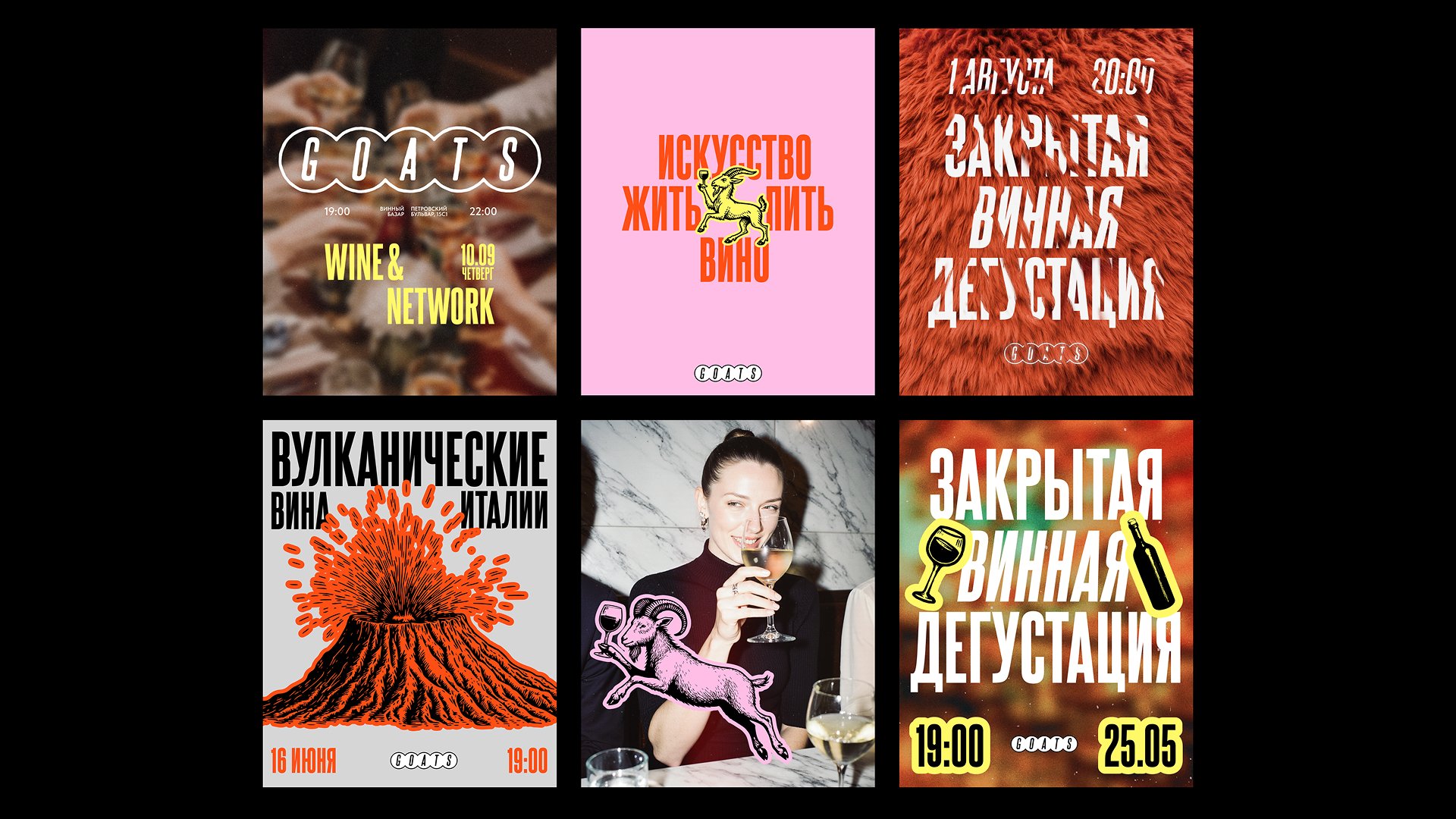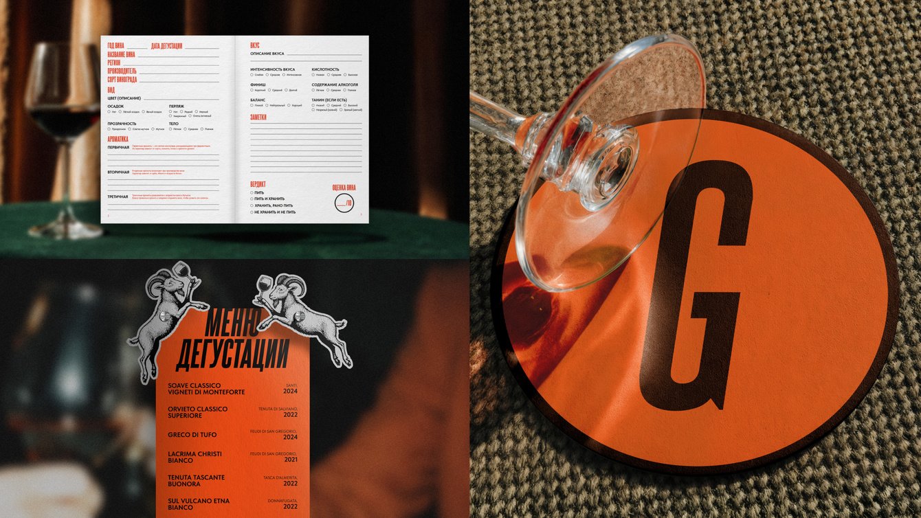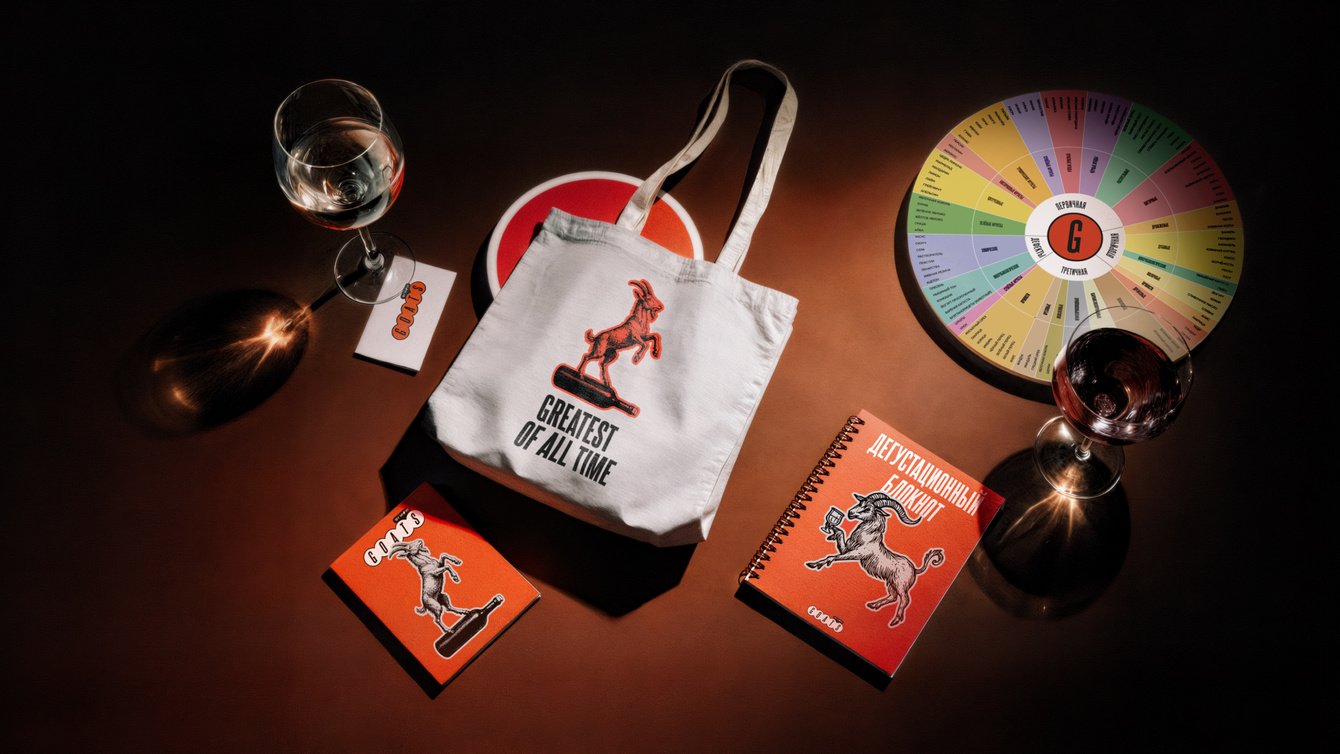 Мы разработали закрытый винный клуб с целостной визуальной, смысловой и организационной системой. Аббревиатура GOATS в названии расшифровывается как «greatest of all time», демонстрируя высокий уровень экспертизы участников клуба, и одновременно отсылает к образу козла как символу винной культуры. Козёл стал центральным персонажем айдентики. Такой образ позволяет использовать ироничную, смелую и выразительную коммуникацию. Уже на этом этапе мы понимали, что брендинг должен быть не просто красивым, а эмоционально заразительным — таким, который вызывает симпатию, улыбку и желание быть частью этого события у публики, которую сложно удивить формальными решениями без творческого подхода.