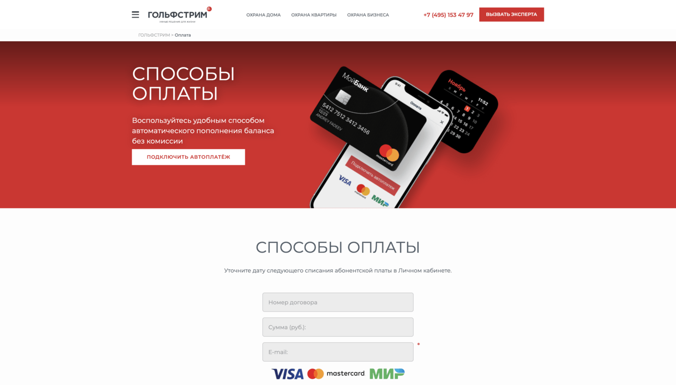 Была поставлена задача разработать новый, современный и интерактивный главный сайт для компании Гольфстрим и интегрировать его с внутренними сервисами компании. Разработать платежную систему для проведения обычных и автоматических платежей по договорам, а также провести работы по SEO оптимизации.