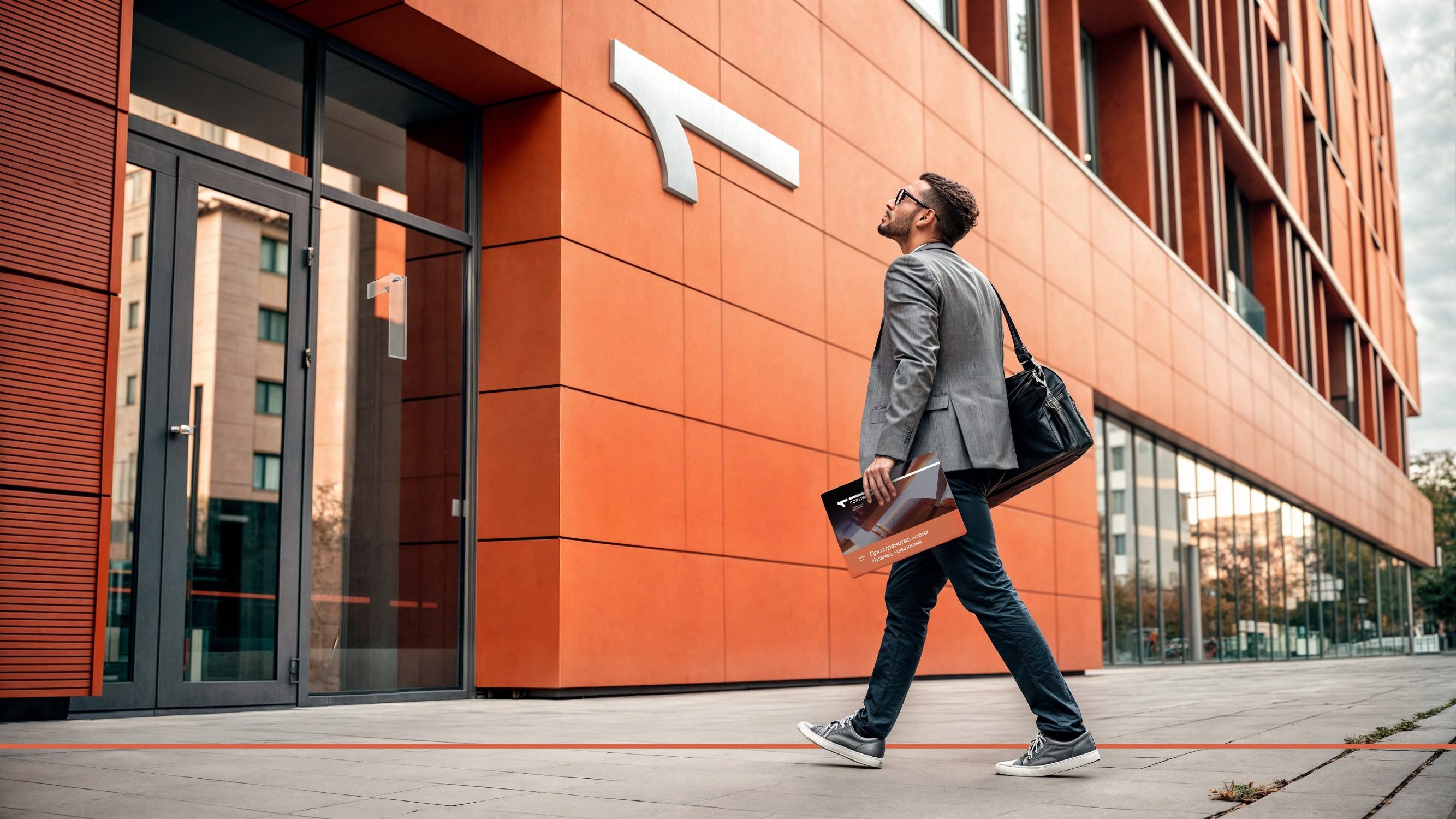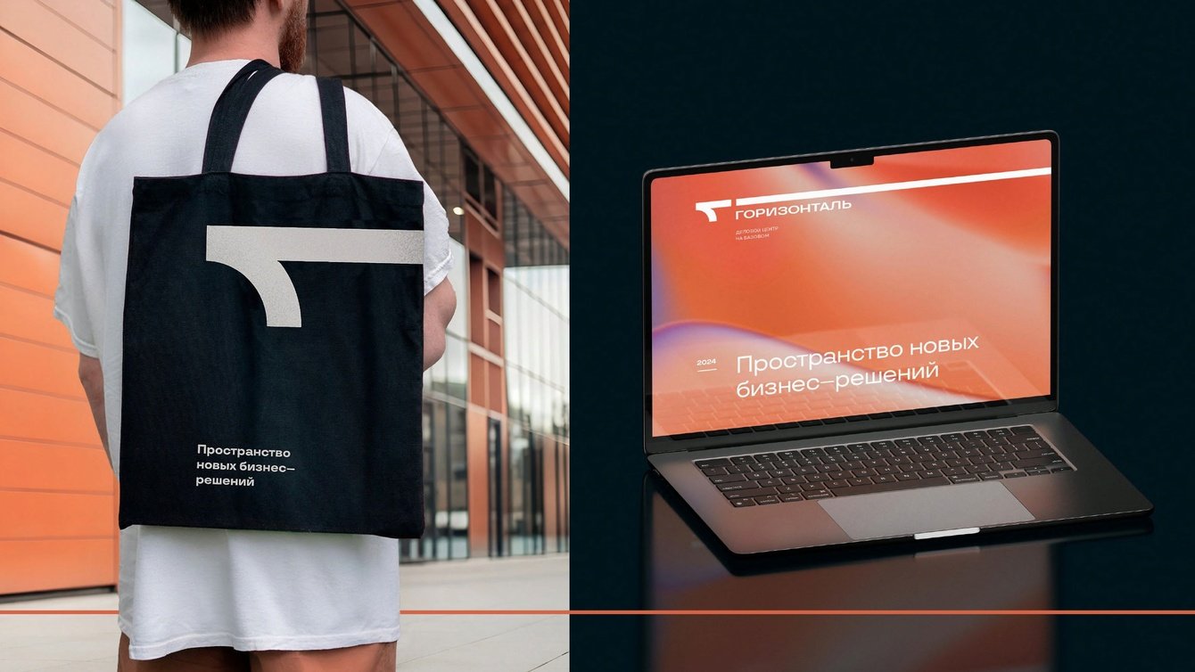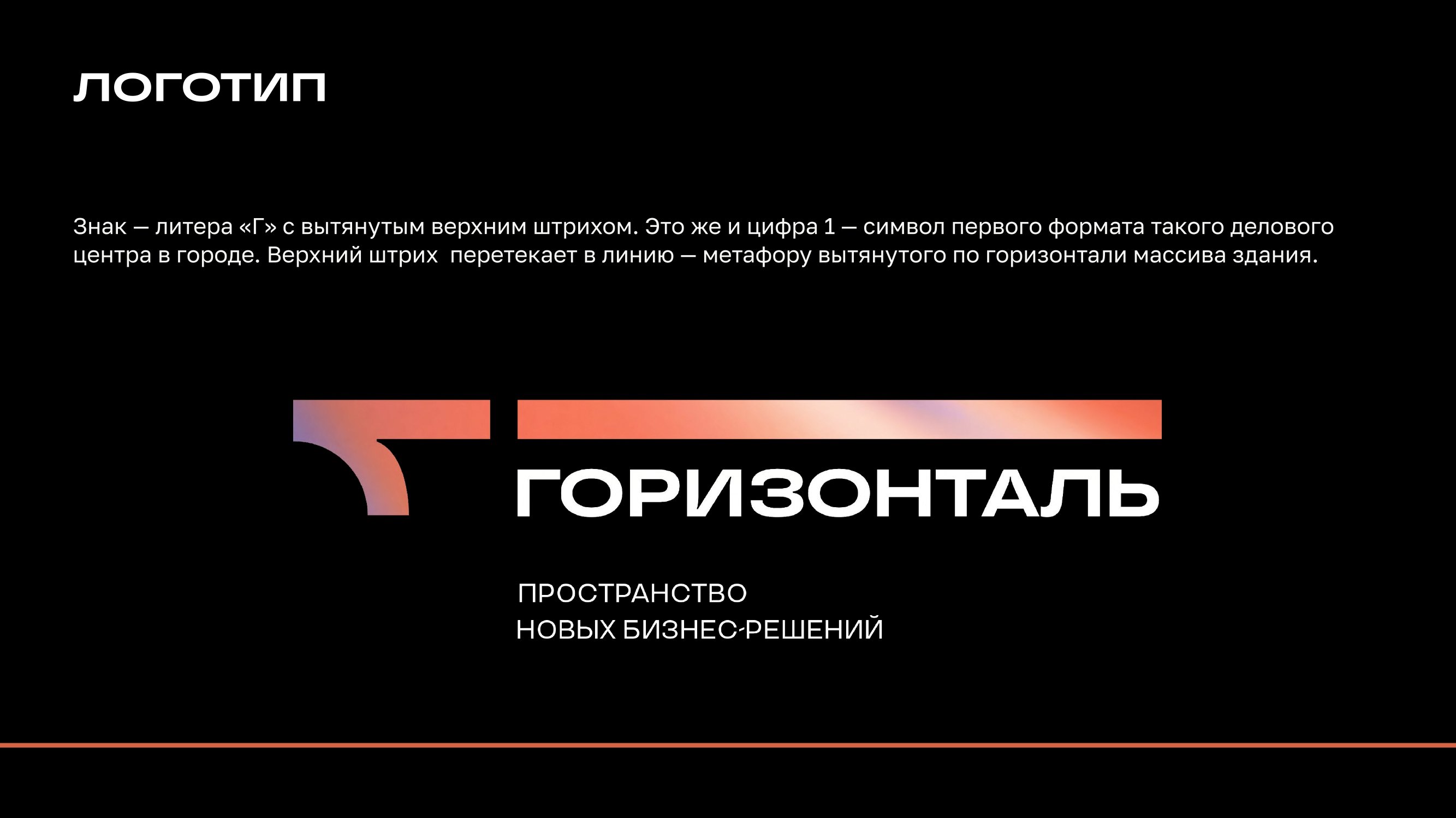 Горизонтальная линия отражает внешний облик здания. Буква «Г» является дополнительной, хоть и неявной, отсылкой к цифре «1», что подчеркивает уникальность проекта для города. Ценности бренда повлияли на открытость композиции и выбор цветов. Сиреневый отражает инновационность проекта, а оранжевый — энергию лидерства и взаимодействия. Градиент олицетворяет динамику и движение. Знак логотипа выделяется на фоне конкурентов. Система адаптивна на разные носители. Через айдентику и фирменный стиль усилено позиционирование центра как «связующего звена». На основе предложенной концепции был упакован брендбук.