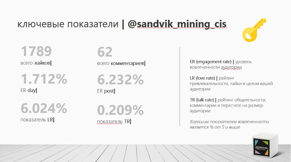 Engagement Rate стабильно держался выше 5% на протяжении всего срока работы над проектом, несмотря на узкую направленность отрасли, а также строго регламентированное количество публикаций в неделю – 2 поста и 5 сторис. Ежеквартальный отчёт всегда радовал глаз хорошими показателями: