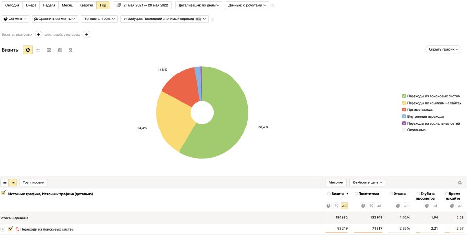 По метрикам: переходы из поисковых систем за последний год составили 58,4%, что значит 93 249 визитов.