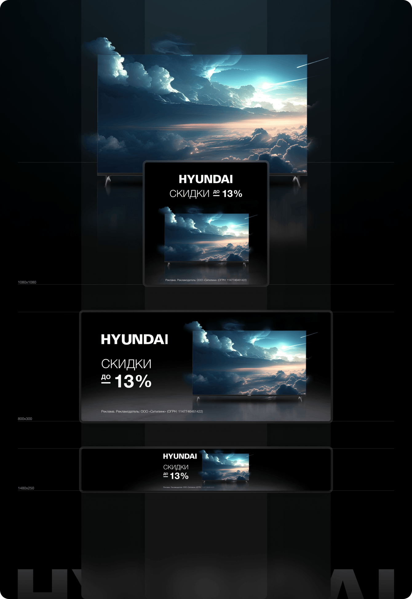 Для Hyundai мы: разрабатываем концепции, которые базируются на нами разработанных шаблонах. Создаём презентации, сочетающие продуктовый фокус и креативный подход, что делает их понятными, эффектными и запоминающимися. Разрабатываем креативы для продвижения продукции, включая адаптивные решения для маркетплейсов и digital-каналов.