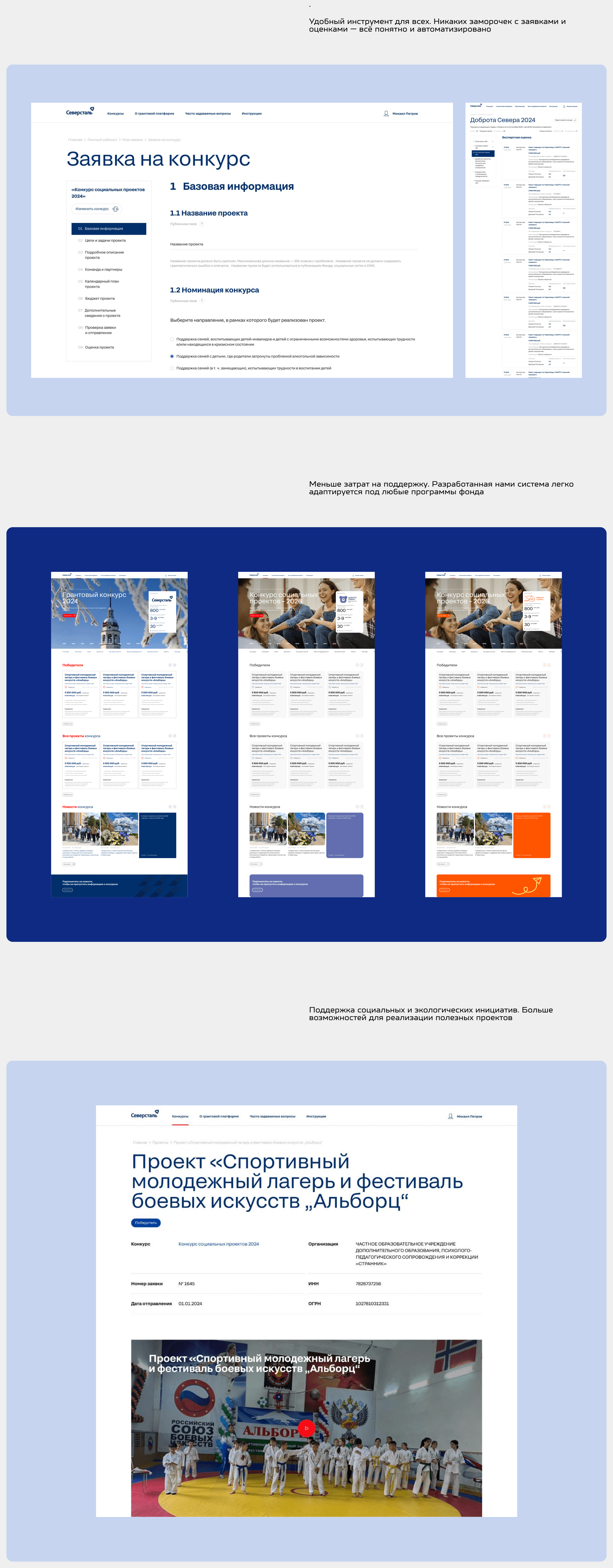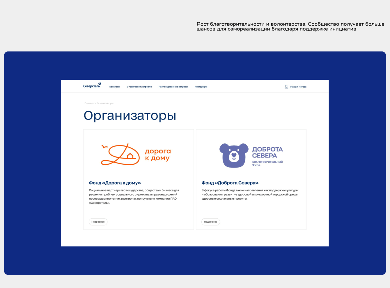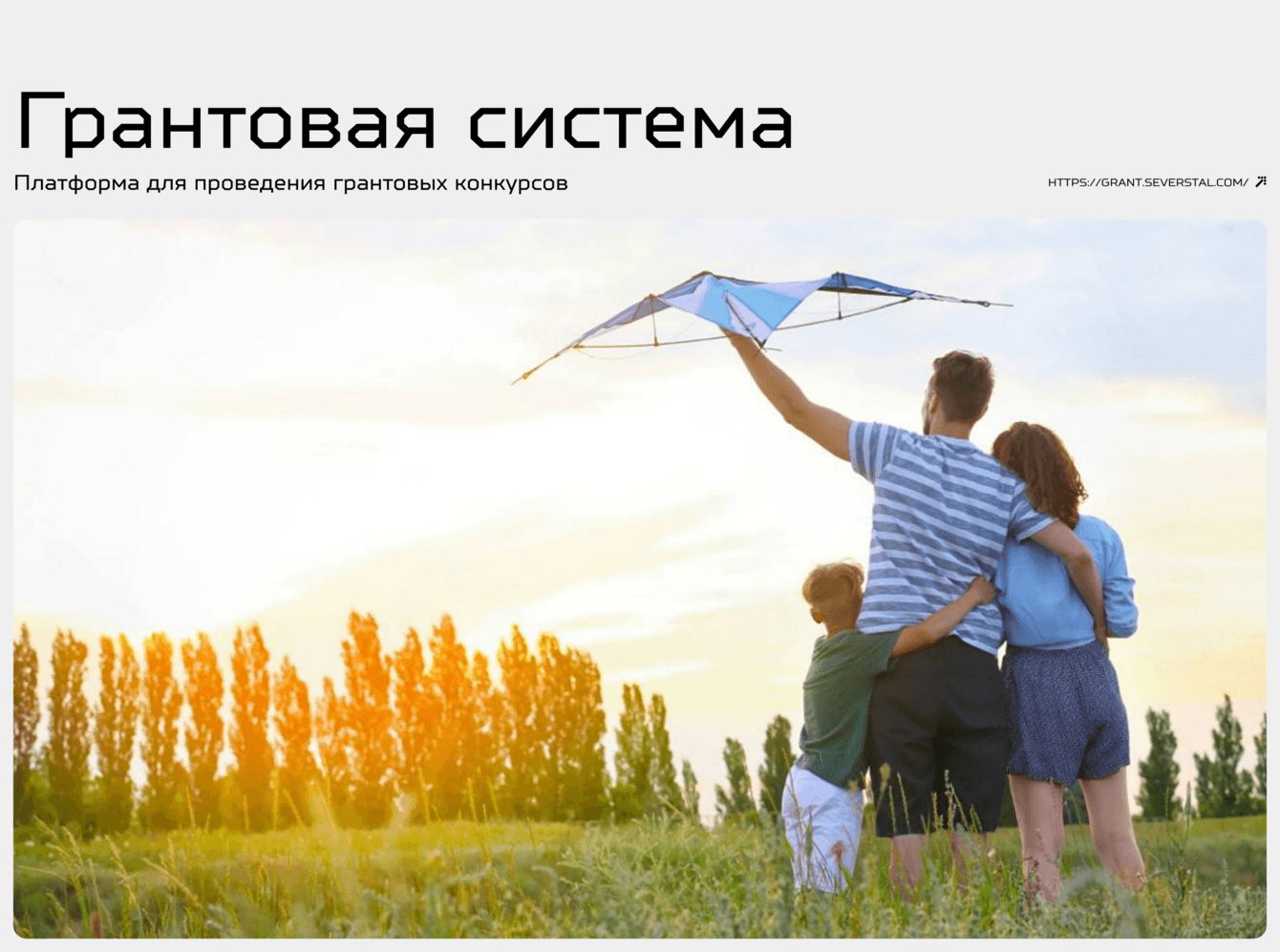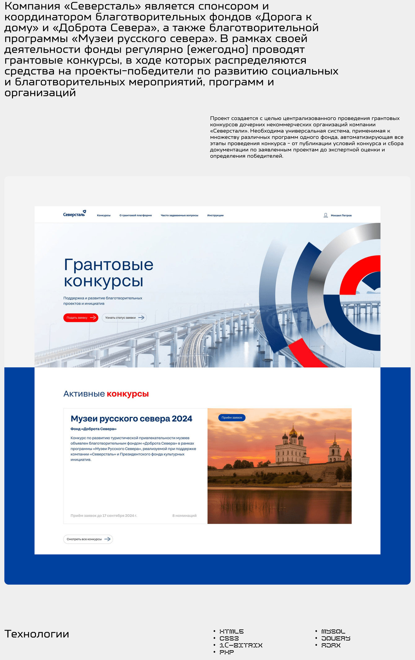 Организация централизованной системы для проведения конкурсных мероприятий среди дочерних некоммерческих организаций компании «Северсталь». Необходимо создание единой универсальной структуры, подходящей для множества различных программ фонда, автоматически охватывающей весь цикл процесса конкурса — от объявления условий участия до этапа экспертизы и выявления победителей.