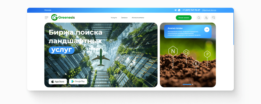 «Greenesis» — стартап компании из сферы озеленения. Это биржа ландшафтных услуг, где заказчики размещают заявки, а исполнители предлагают свои услуги.