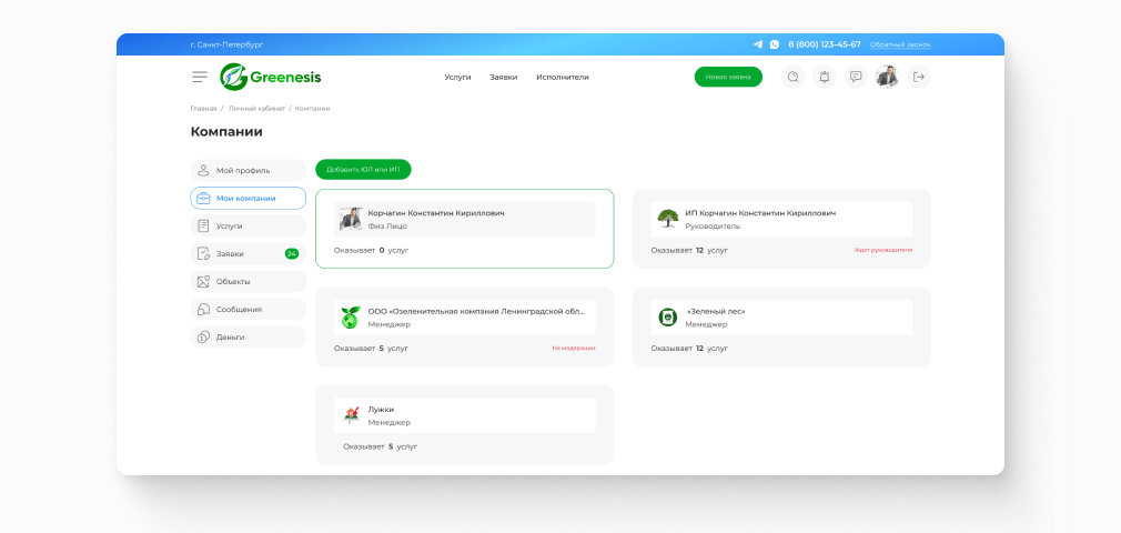 Один пользователь может зарегистрировать несколько профилей на платформе, например: физлицо, чтобы заказать работы на своем участке; ИП, оказывающее услуги; ООО, где человека добавили сотрудником. Переключаться между ролями можно без повторного входа.