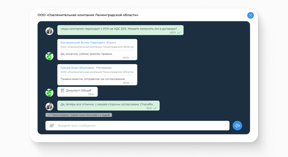 Если от компании отвечает не владелец, а сотрудник, заказчик сразу видит, с кем общается: в чате отображаются название компании, имя и должность специалиста.