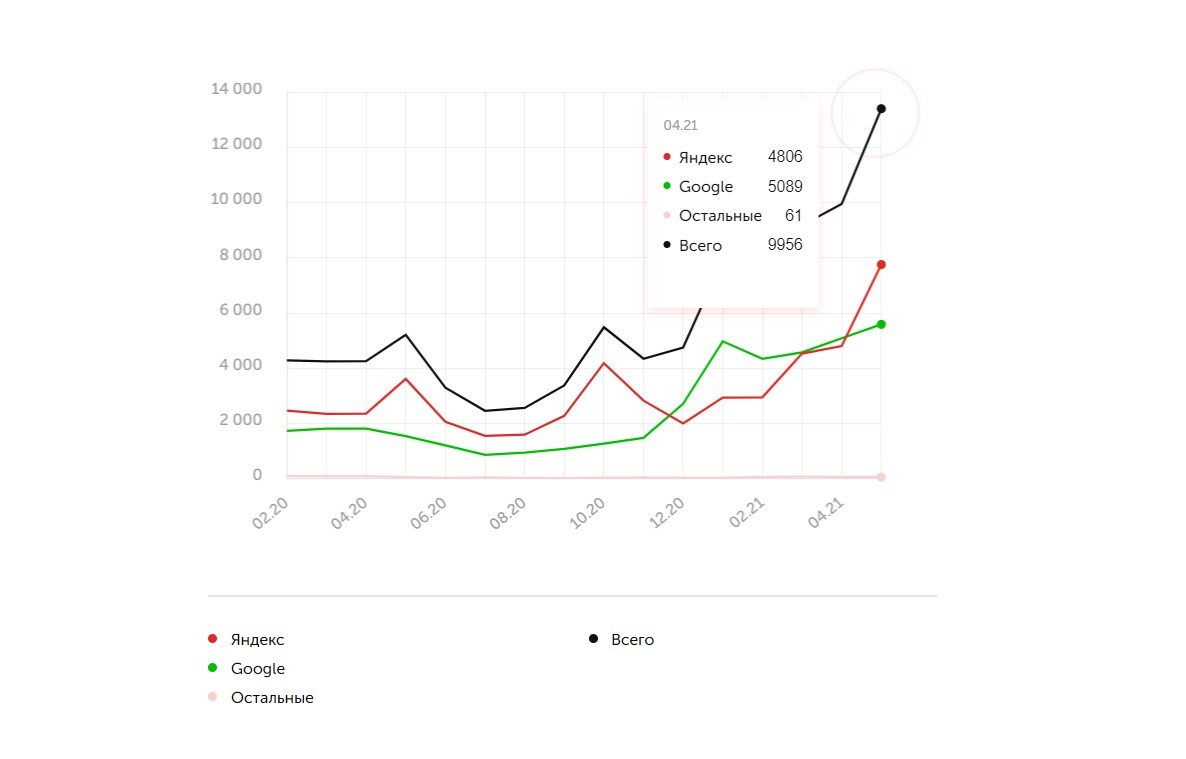 Увеличение видимости положительно повлияло на трафик — ресурс стал чаще появляться в выдаче, а количество визитов возросло в 5 раз — с 2500 до 13000 переходов ежемесячно.