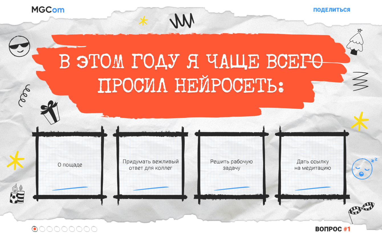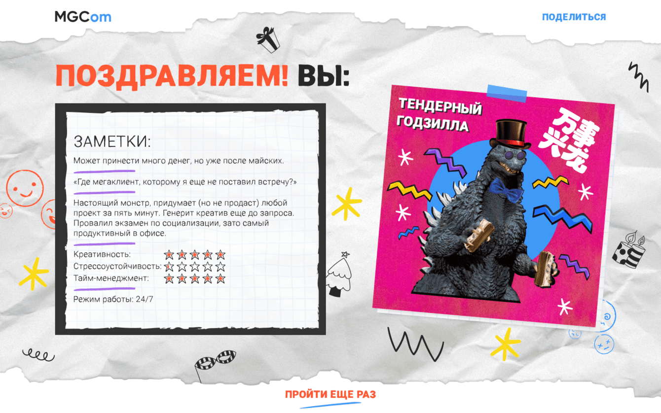 Перед нами стояла непростая задача: в сжатые сроки придумать и реализовать проект, который зацепит диджитал-специалистов — людей с высокой интернет-насмотренностью, которых сложно удивить и тем более рассмешить. Мы решили сделать мемный квиз о том, как наша аудитория ощущает себя в конце года: пройти по тонкой грани между постиронией и цинизмом, собрав в одном проекте наболевшее и смешное.