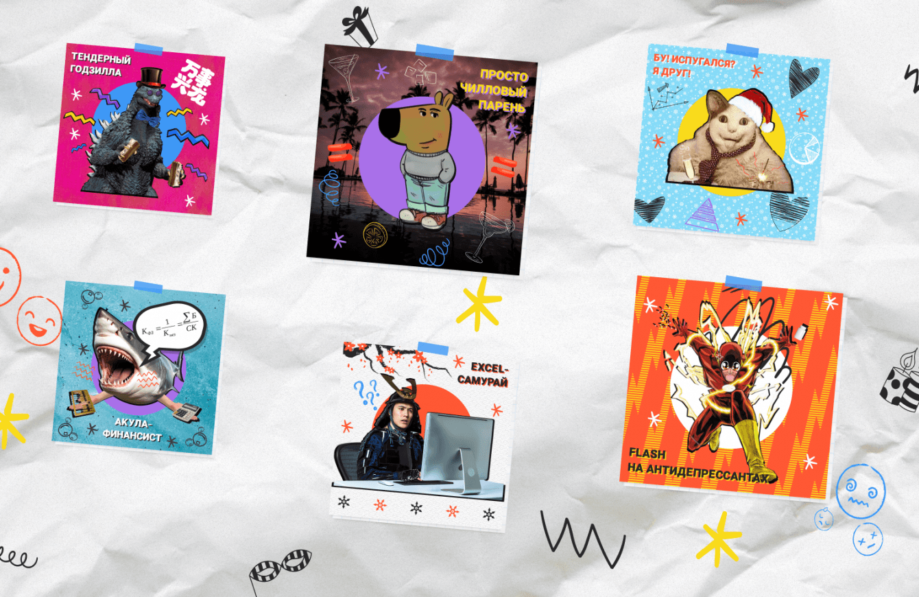 1. Сформировали креативную идею и механику проекта: легкий контент с вирусным потенциалом, в котором трендовые мемные персонажи («Бу! Испугался? Я друг!» и другие) выбираются из типичных ситуаций конца года — выгорания, конфликтов и так далее.