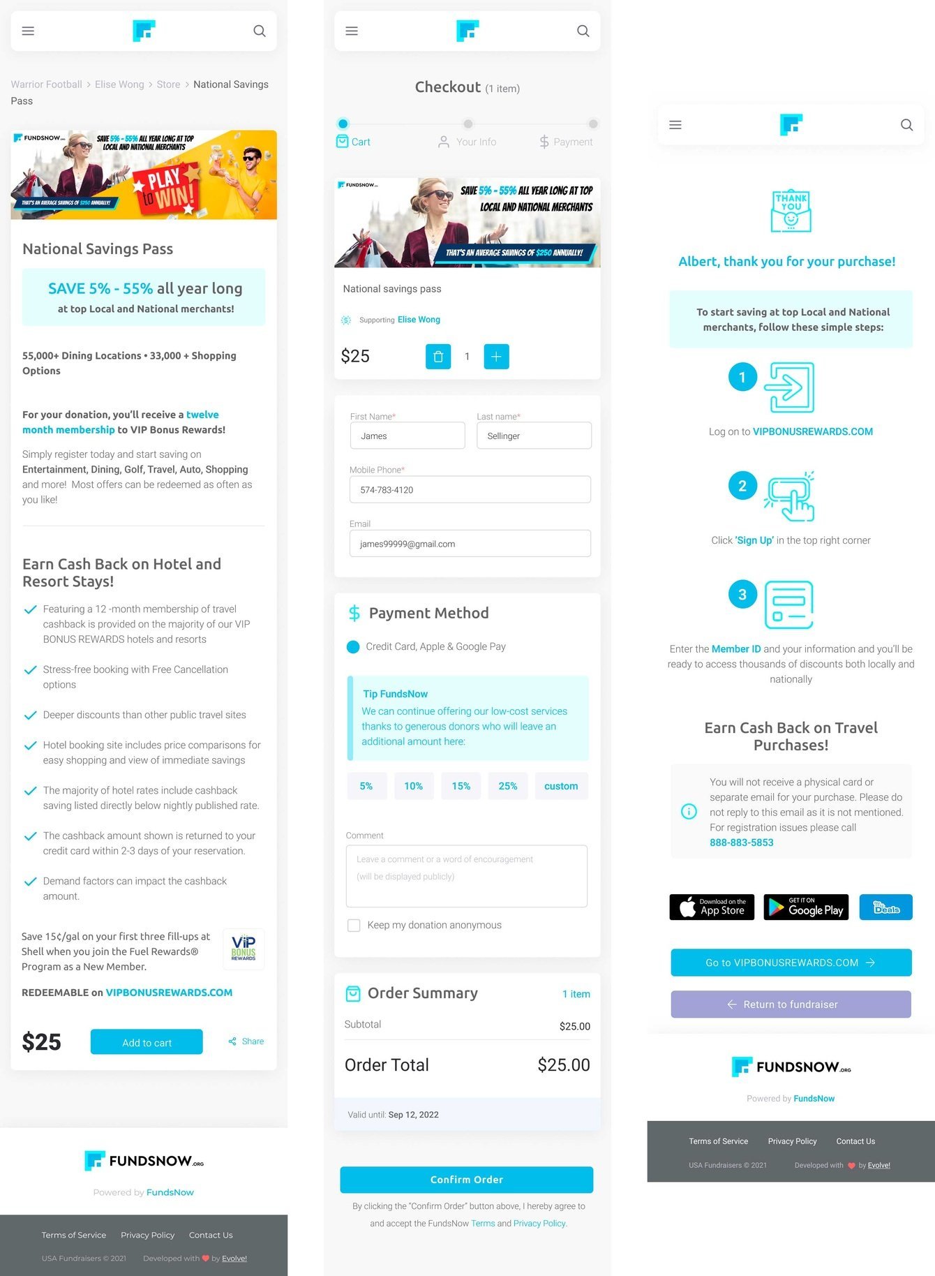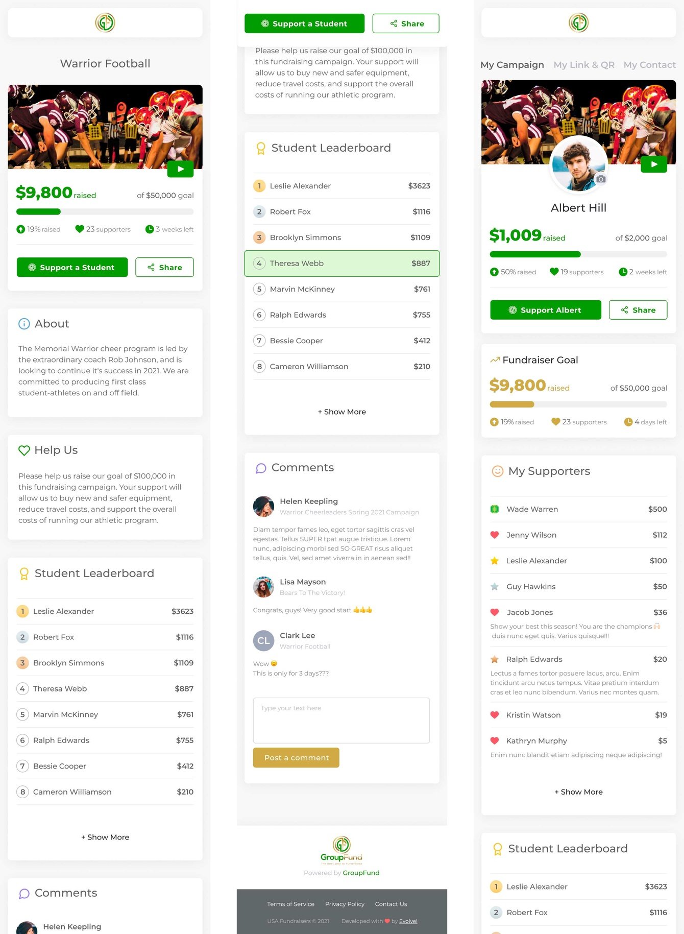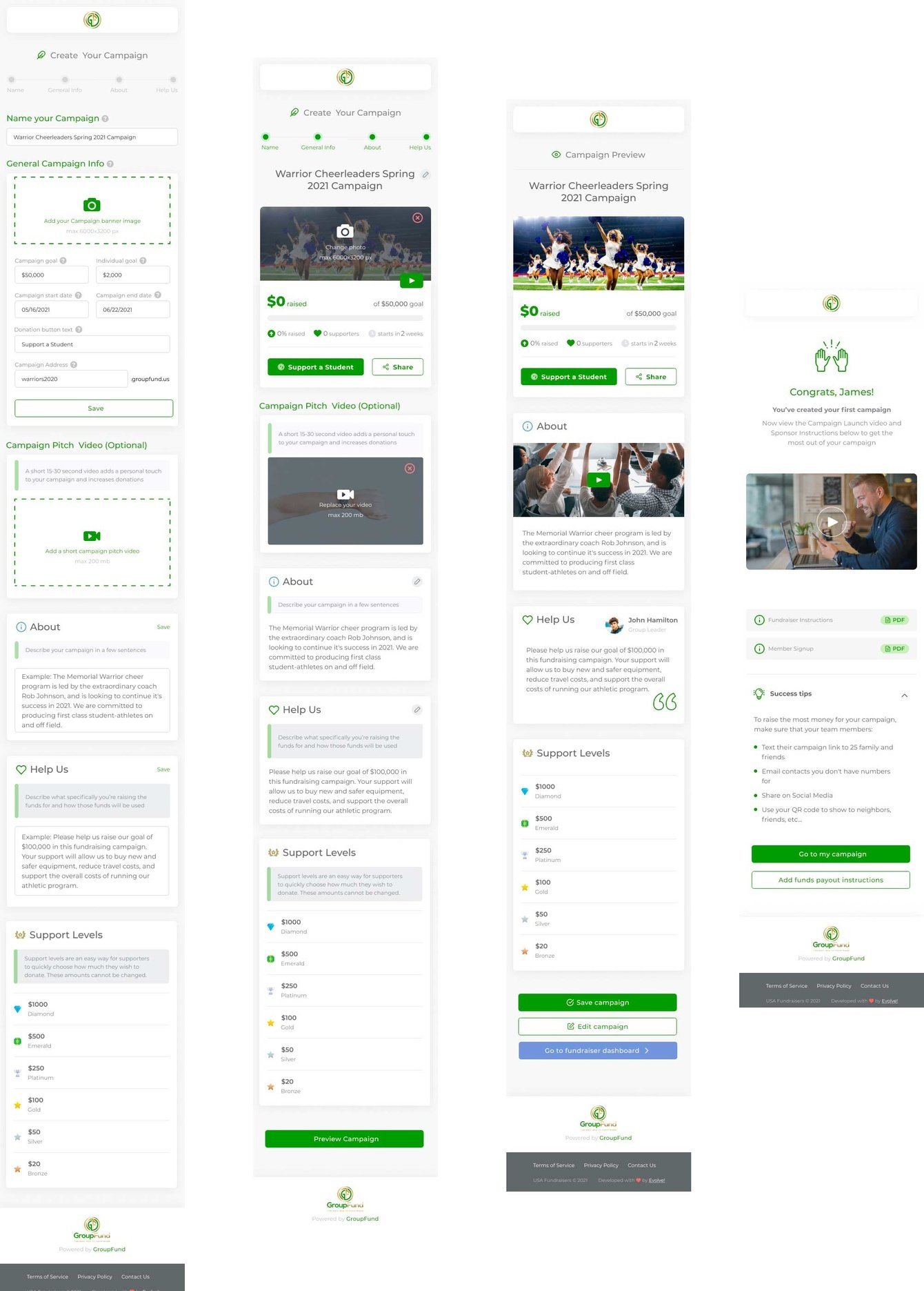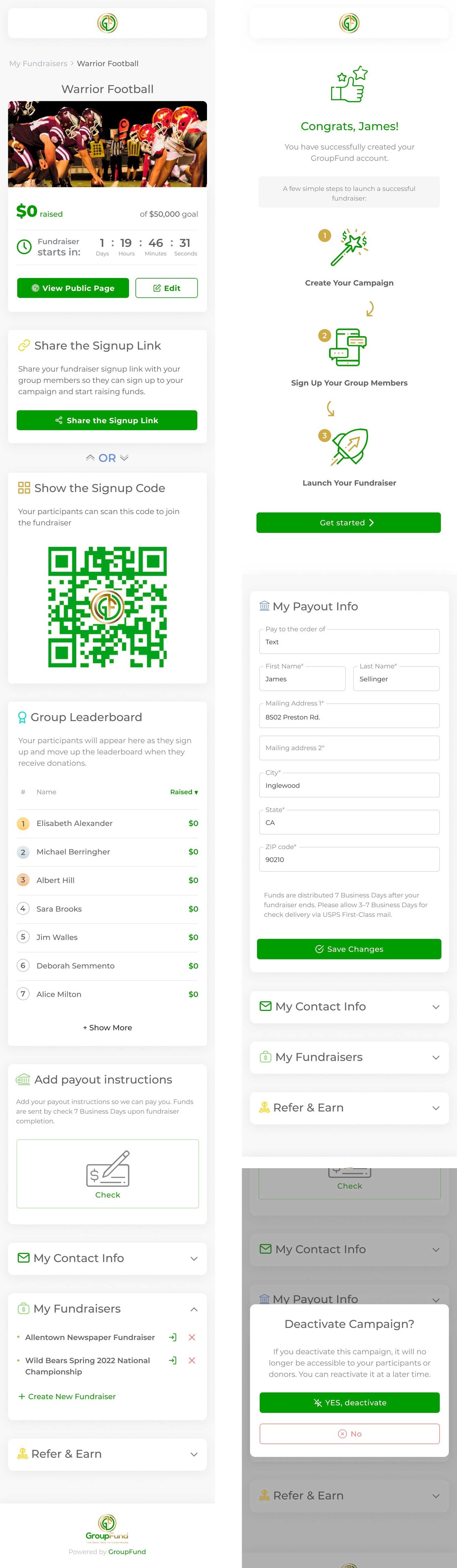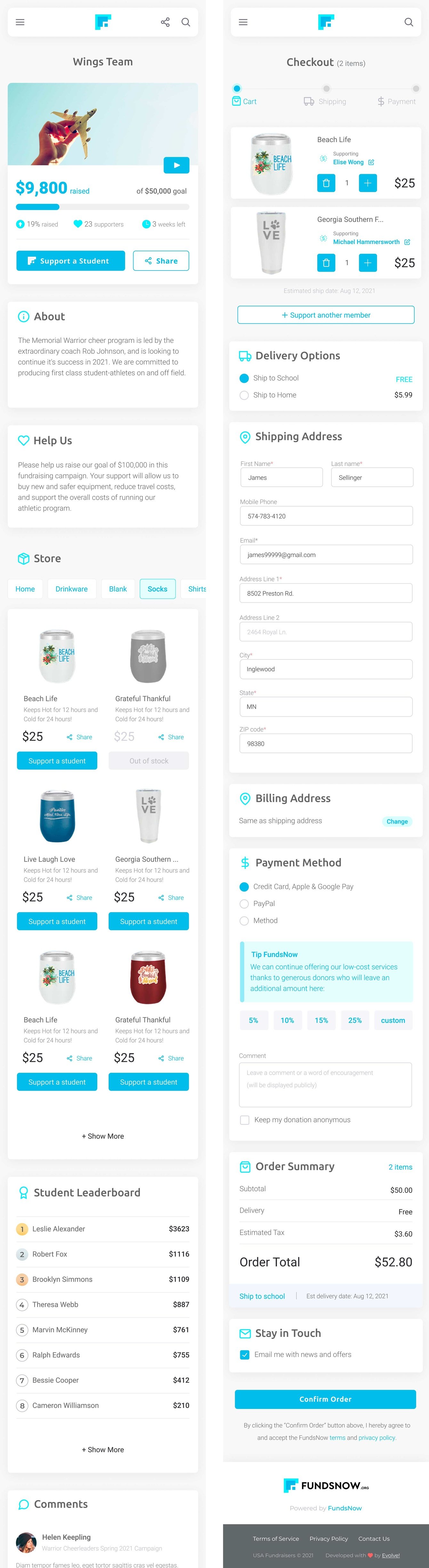 Спонсоры могут быстро и безопасно поддержать кампанию, используя кредитные карты, Apple Pay и Android Pay или чек. Интуитивный, не перегруженный, фирменный дизайн выносит ключевую информацию на первый план и делает использование GroupFund приятным.