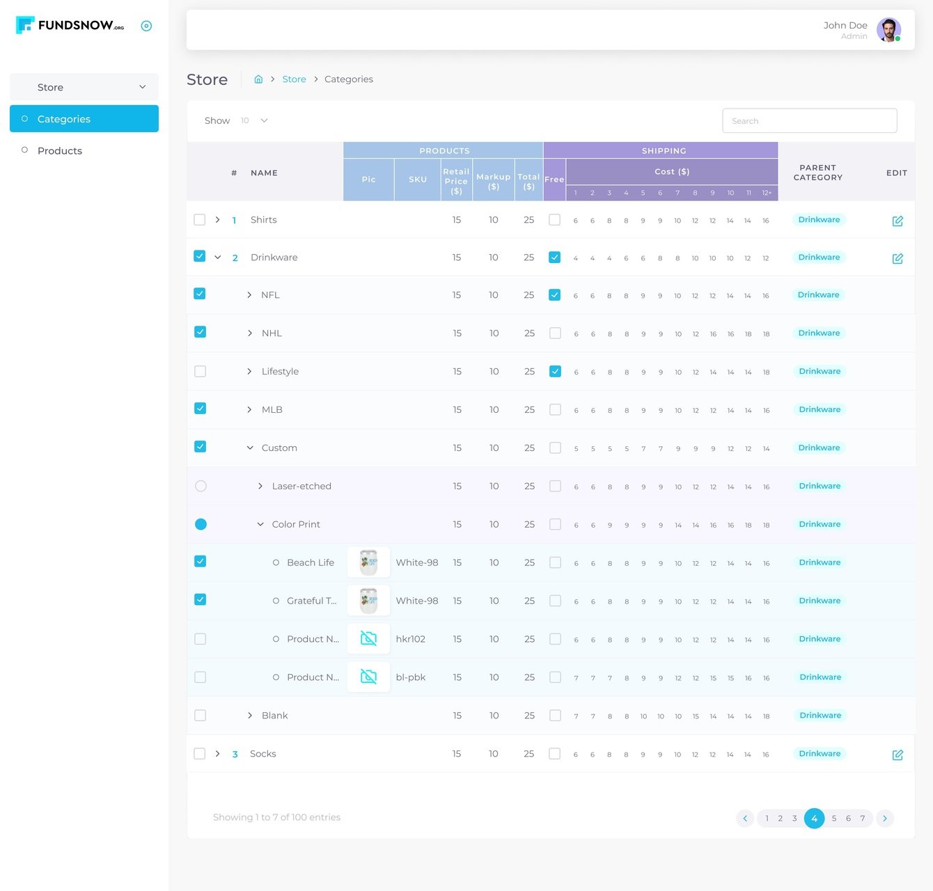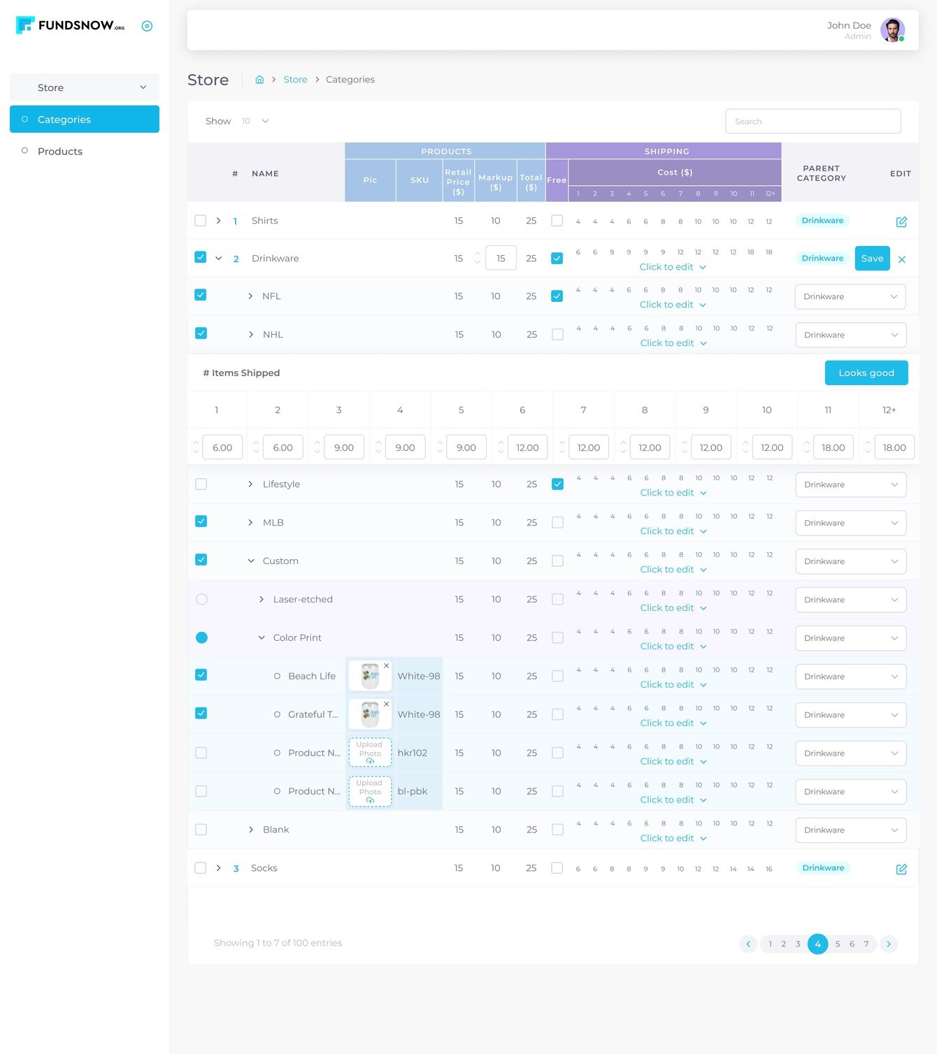 Компания хранит номенклатуру в системе ShipStation. Мы реализовали синхронизацию с ней, а также удобное управление товарами на одном экране. Для каждой категории товаров, а также товара индивидуально можно настраивать стоимость доставки на дом в зависимости от количества, а также наценку к базовой цене. Всё это можно делать как глобально, так и в рамках отдельной кампании.