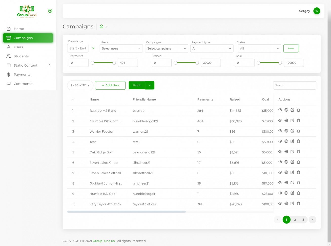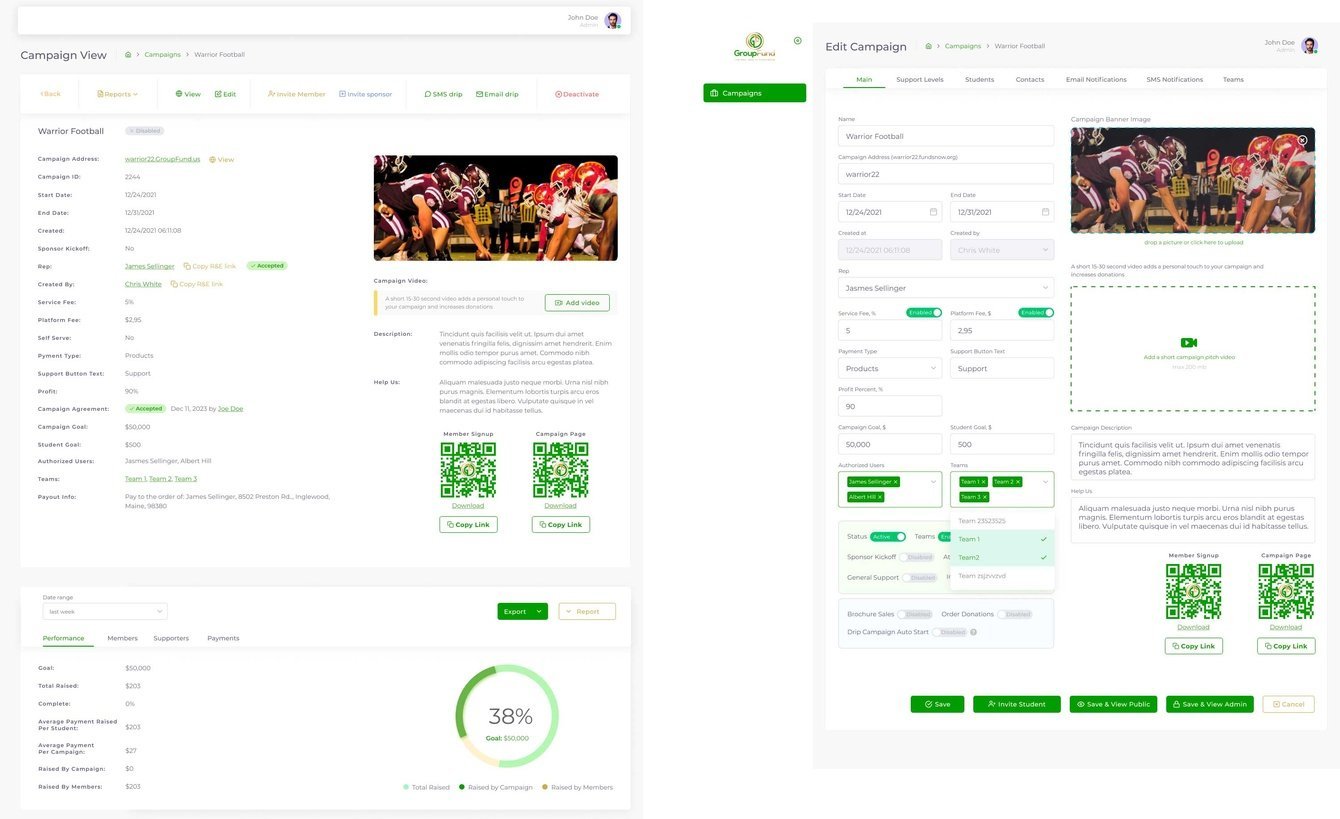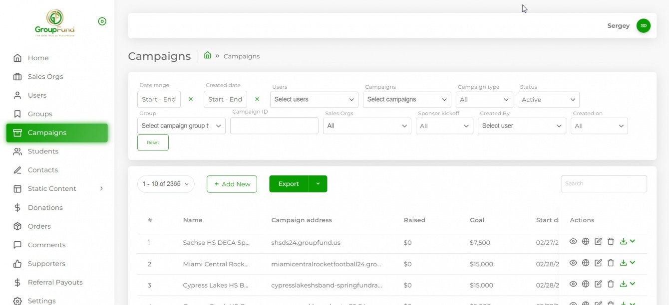 Административная панель GroupFund спроектирована для работы как на ПК, так и на мобильных устройствах. Она позволяет администраторам вести весь жизненный цикл кампании в одном интуитивно понятном интерфейсе.