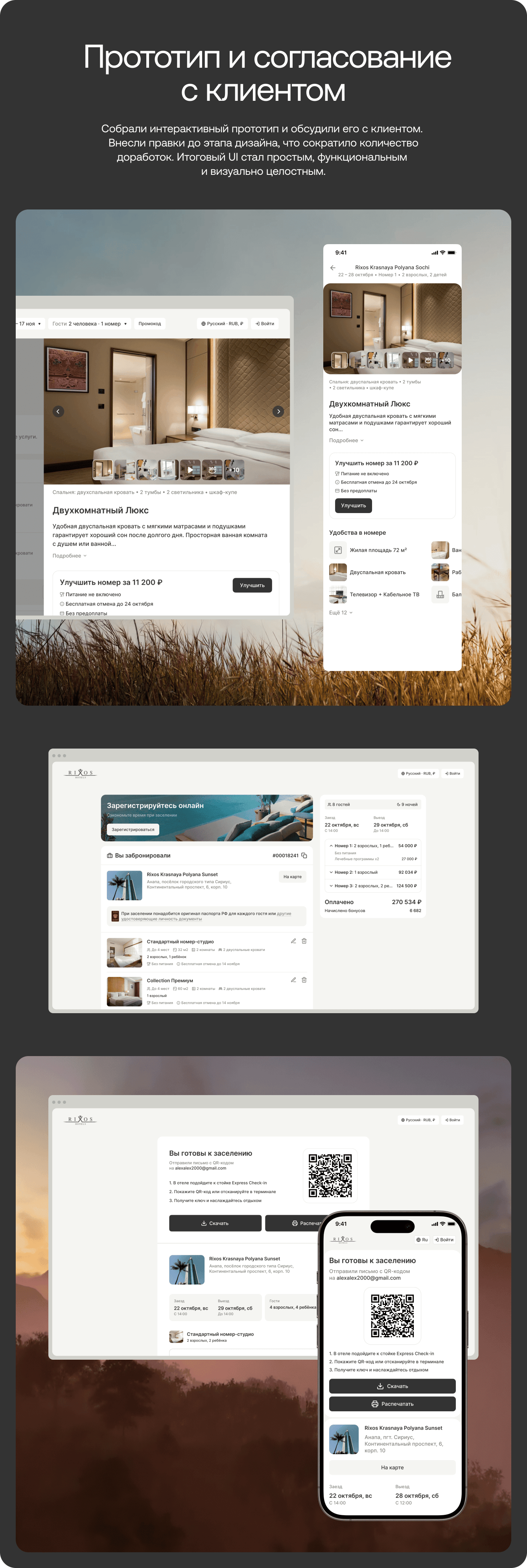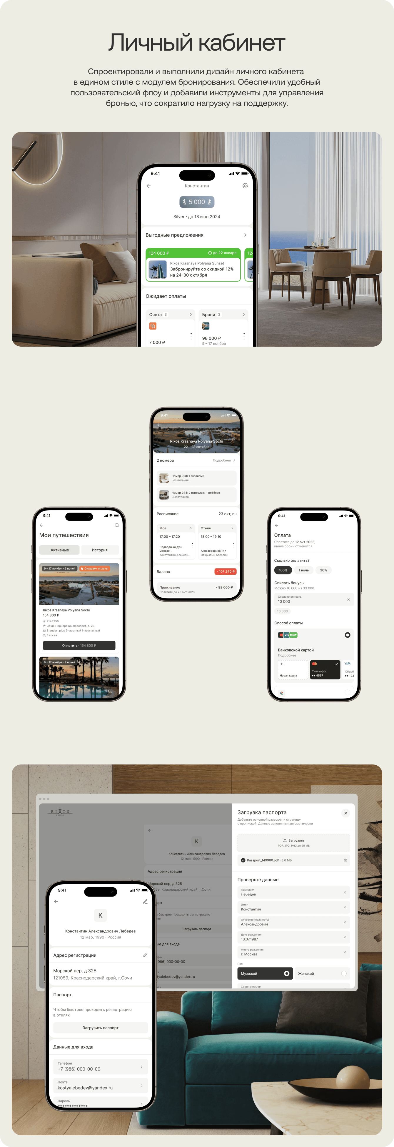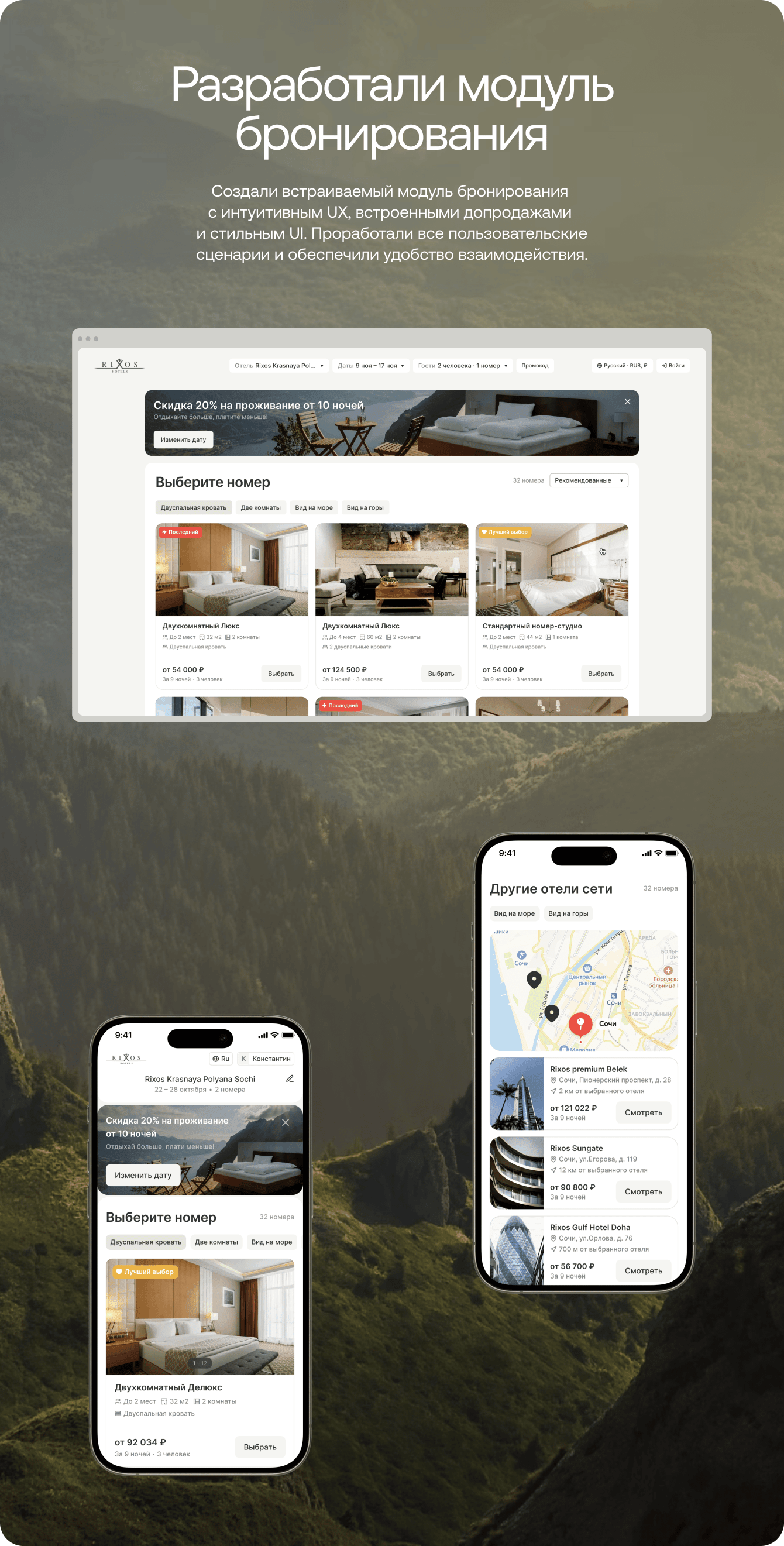 Перед нами стояла задача создать модуль бронирования номеров с упрощенным UX, встроенными допродажами и обновленным UI, который выгодно выделяет сервис среди конкурентов. Дополнительно — разработать личный кабинет, сохраняя единую визуальную стилистику.
