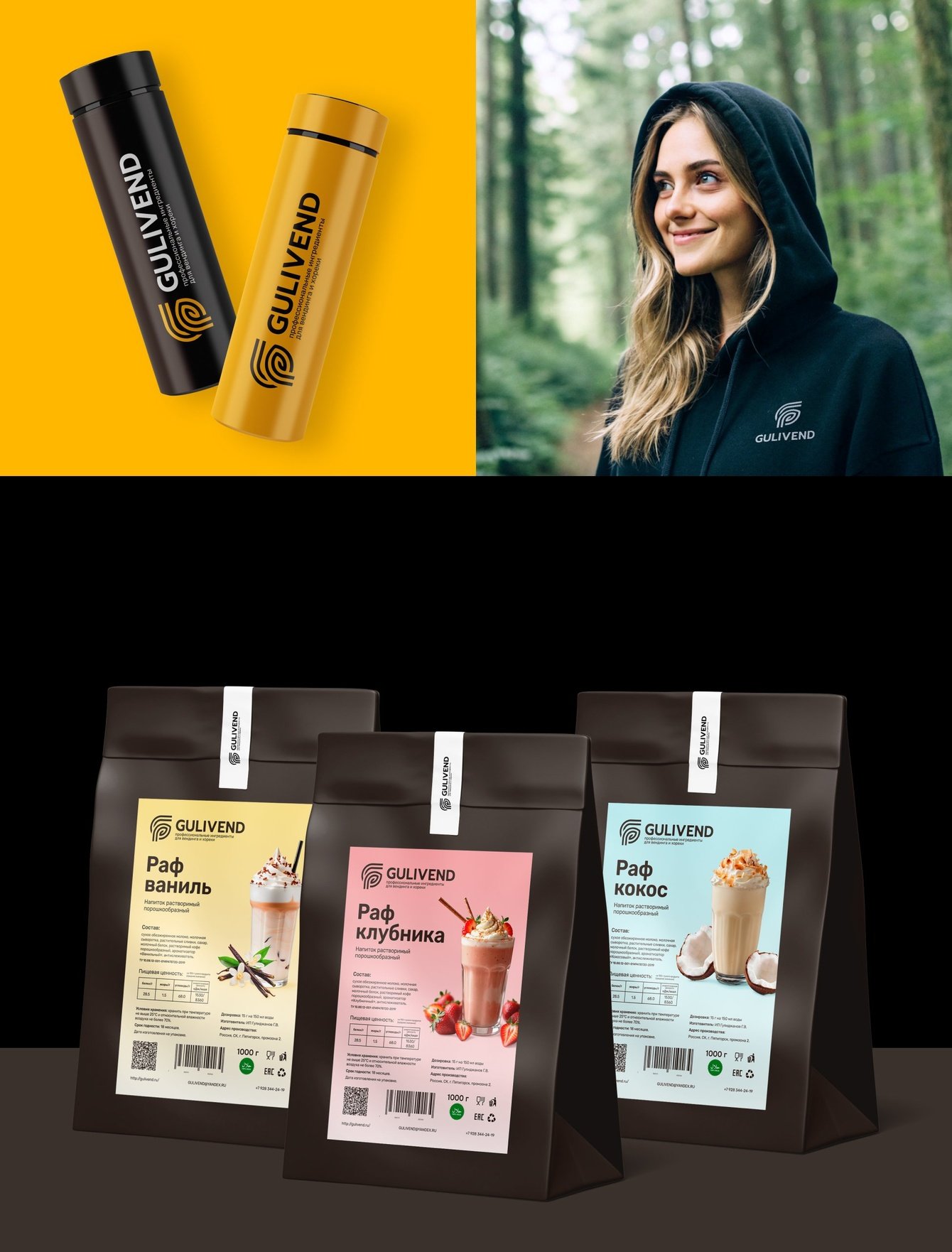 Компания Gulivend производит профессиональные ингредиенты для вендинга и хореки. Компания основана в 2018 году. Задача заключалась в создании брендинга для российского рынка.
