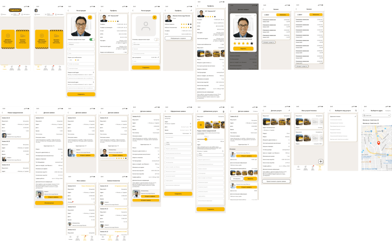 После подписания договора и начала сотрудничества мы спроектировали, отрисовали и согласовали с клиентом макет каждого экрана приложения.