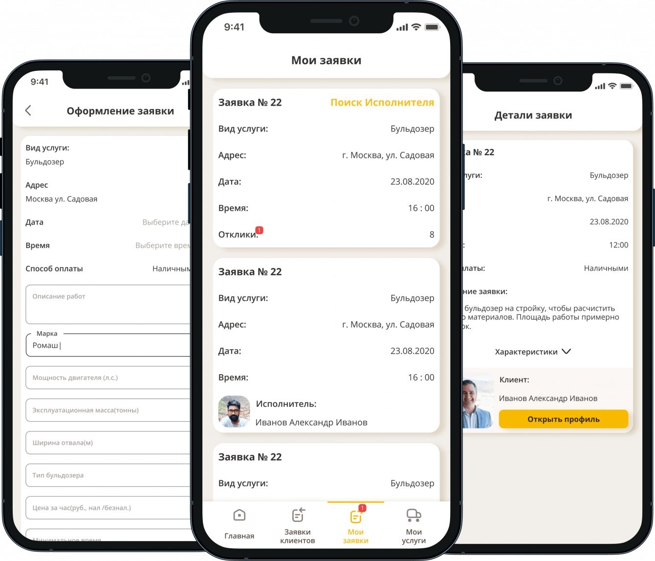 - Исполнители могут откликаться на входящие заявки от Клиентов;