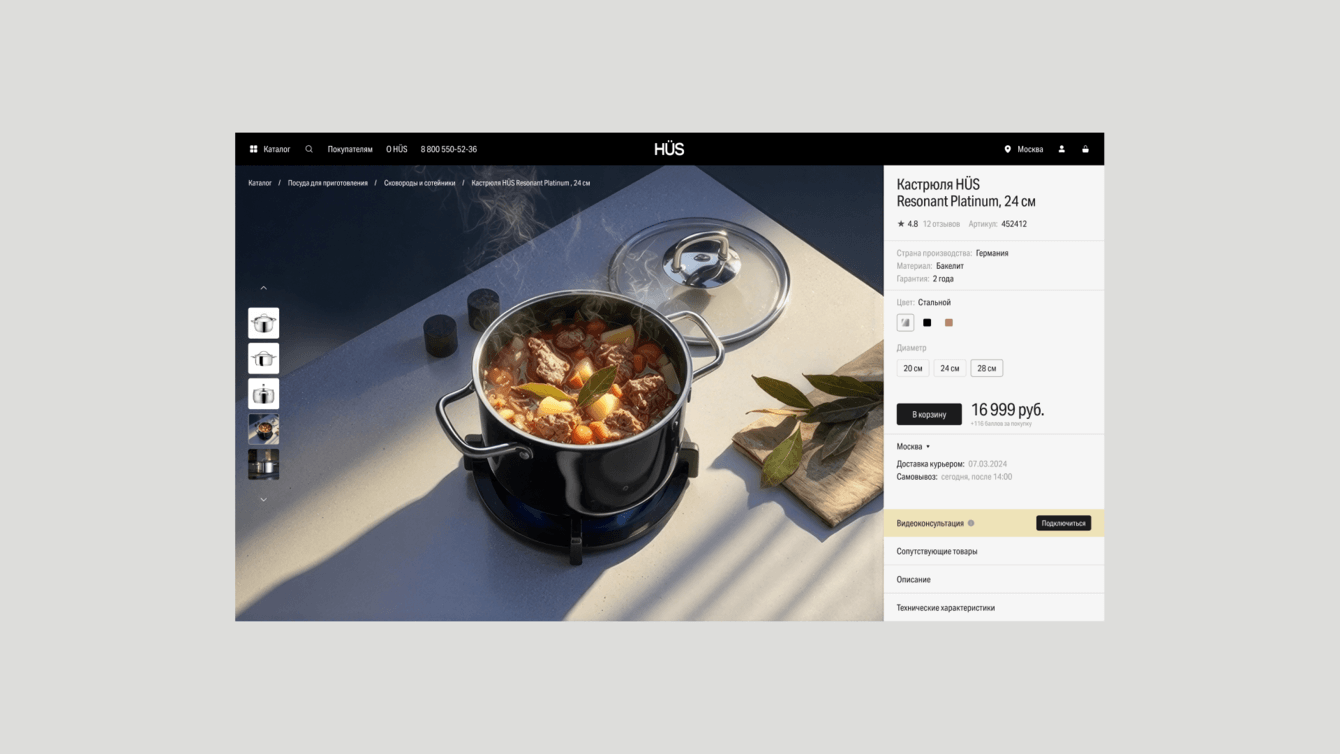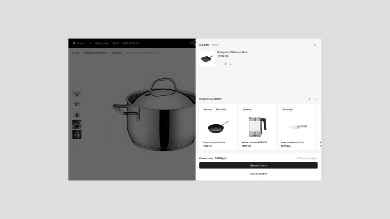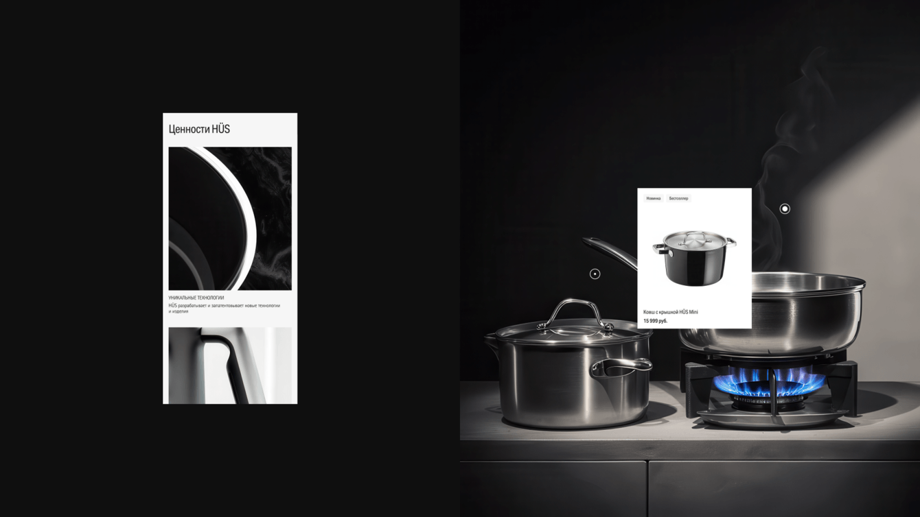 Теперь, когда человек заходит на сайт HÜS, он сразу видит чистый и современный интерфейс с качественными фотографиями товаров и аккуратной вёрсткой. Сайт выглядит так, как ожидаешь от премиального бренда посуды и аксессуаров: ничего не отвлекает, детали товаров хорошо заметны, всё ощущается дорого и стильно. Покупатель больше не сомневается в уровне бренда.