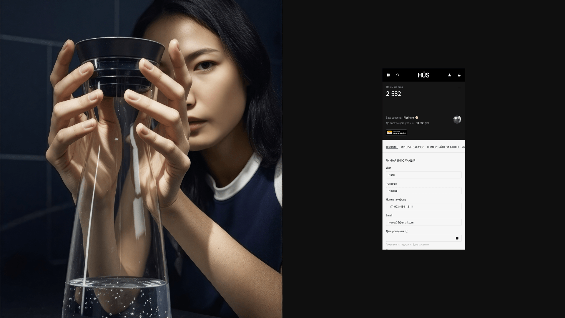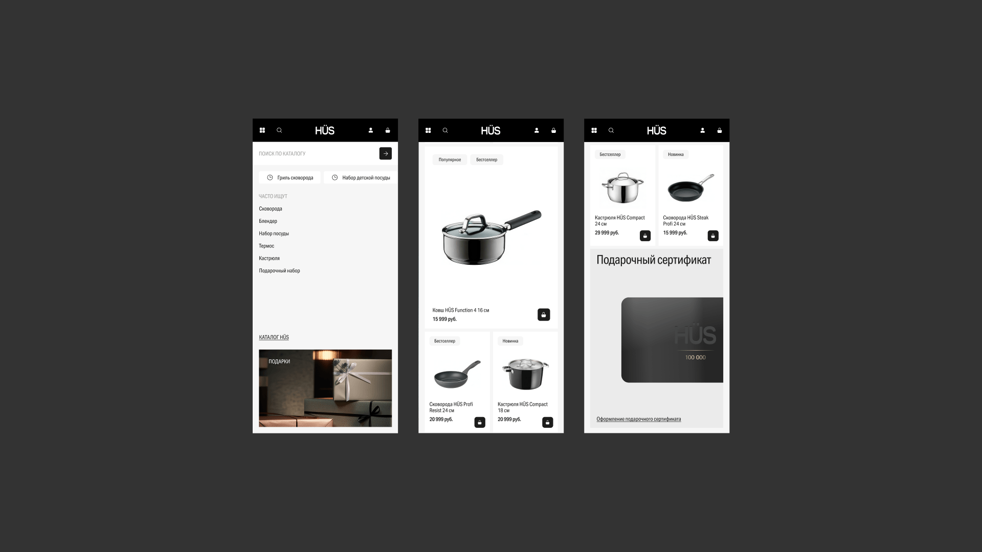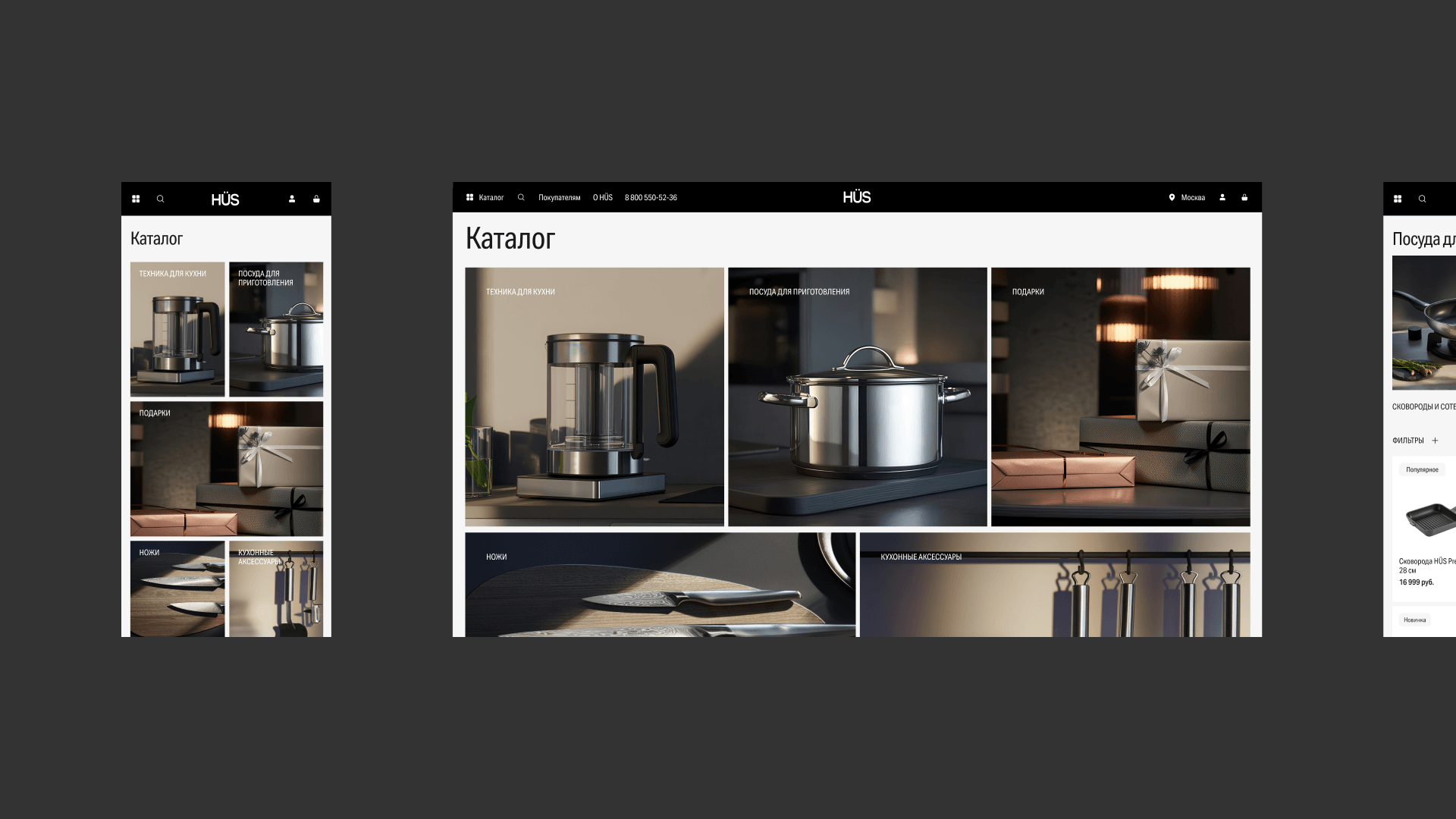 Теперь, когда человек заходит на сайт HÜS, он сразу видит чистый и современный интерфейс с качественными фотографиями товаров и аккуратной вёрсткой. Сайт выглядит так, как ожидаешь от премиального бренда посуды и аксессуаров: ничего не отвлекает, детали товаров хорошо заметны, всё ощущается дорого и стильно. Покупатель больше не сомневается в уровне бренда.