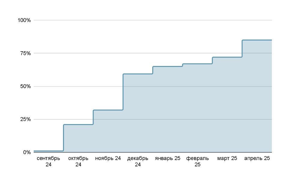 1️⃣ Рост видимости: с 1% до 79%, а в июне это значение достигло 85% — более 2/3 запросов вышли в топ-10.