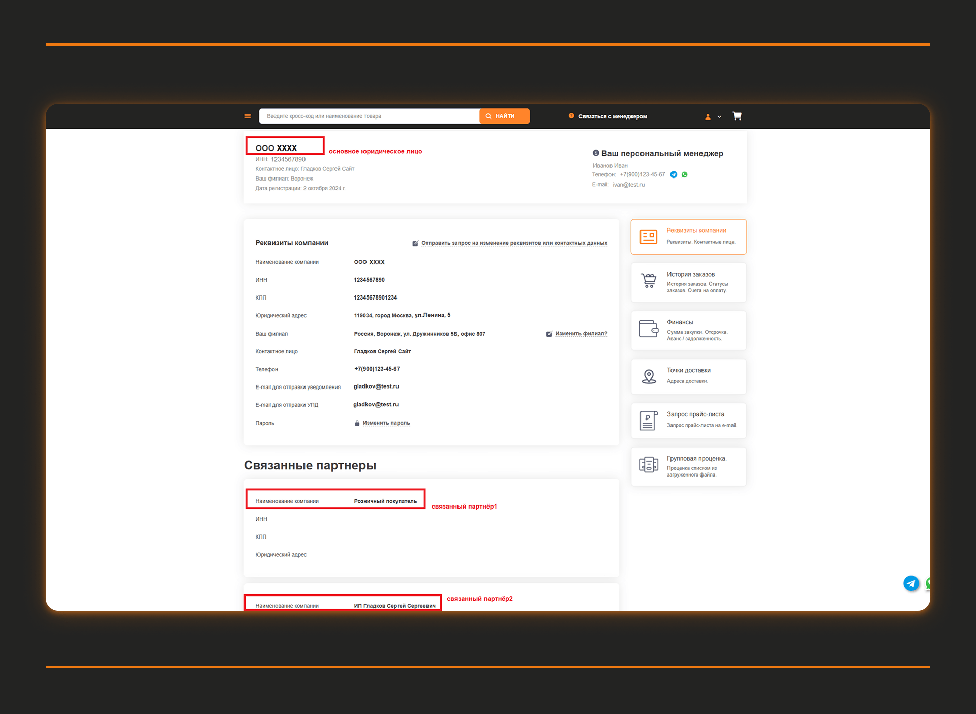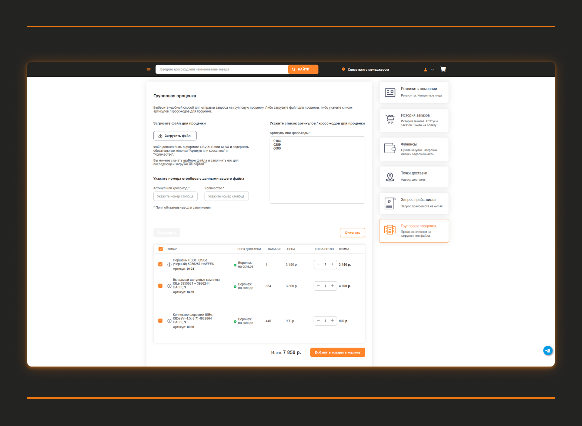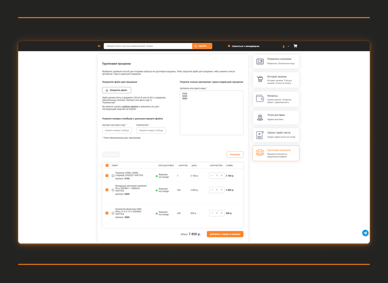 Портал был спроектирован так, чтобы клиенты могли работать максимально автономно. Это критично для B2B-аудитории — СТО, дилеров и корпоративных клиентов, которым важно быстро подбирать запчасти, видеть актуальные цены и остатки и оформлять заказы без постоянного участия менеджера.