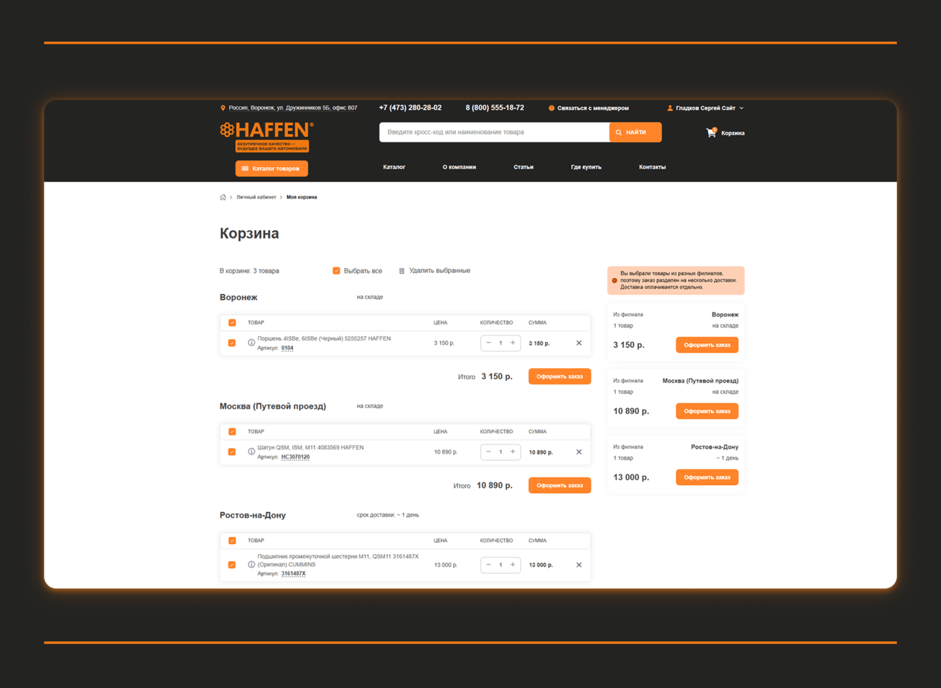 • логика корзины и разделение заказов по складам;