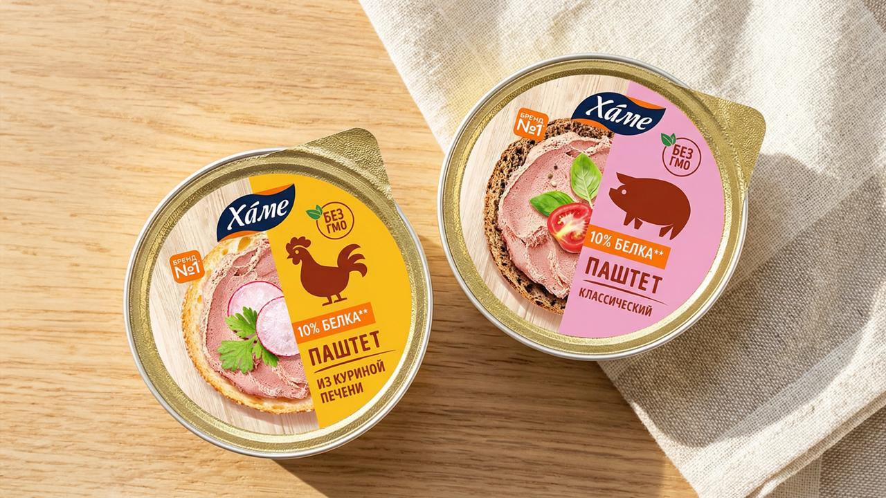 Мы начали с флагманской (классической) линейки, которая формирует основное восприятие бренда и задаёт правила для всей системы. Паштеты — один из самых демократичных продуктов, их едят по-разному и с разным хлебом. Багет, тост, лаваш, хрустящий хлебец — вариантов десятки. Именно это разнообразие сценариев мы вынесли в центр композиции. Крупная аппетитная фуд-зона стала ключевым элементом дизайна: фотореалистичные бутерброды иллюстрируют момент простого удовольствия. Информационный блок с клеймами и характеристиками выстроен в чёткой иерархии и поддерживает рациональный выбор, не споря с эмоциональным образом. Фон стал более глубоким и тёмным, чтобы фуд-зона выглядела ещё аппетитнее. Иллюстрации животных, которые традиционно присутствуют в бренде Хаме, стали тёплыми и аккуратными, сохранив узнаваемость. Теперь дизайн упаковки напрямую поддерживал позиционирование бренда.