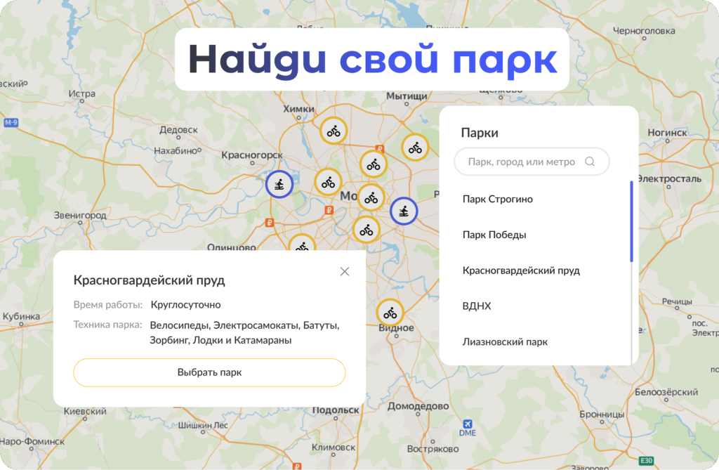 С выводом всех точек проката и фильтрацией по доступным активностям. Пользователь может сразу понять, где он, и что есть поблизости.