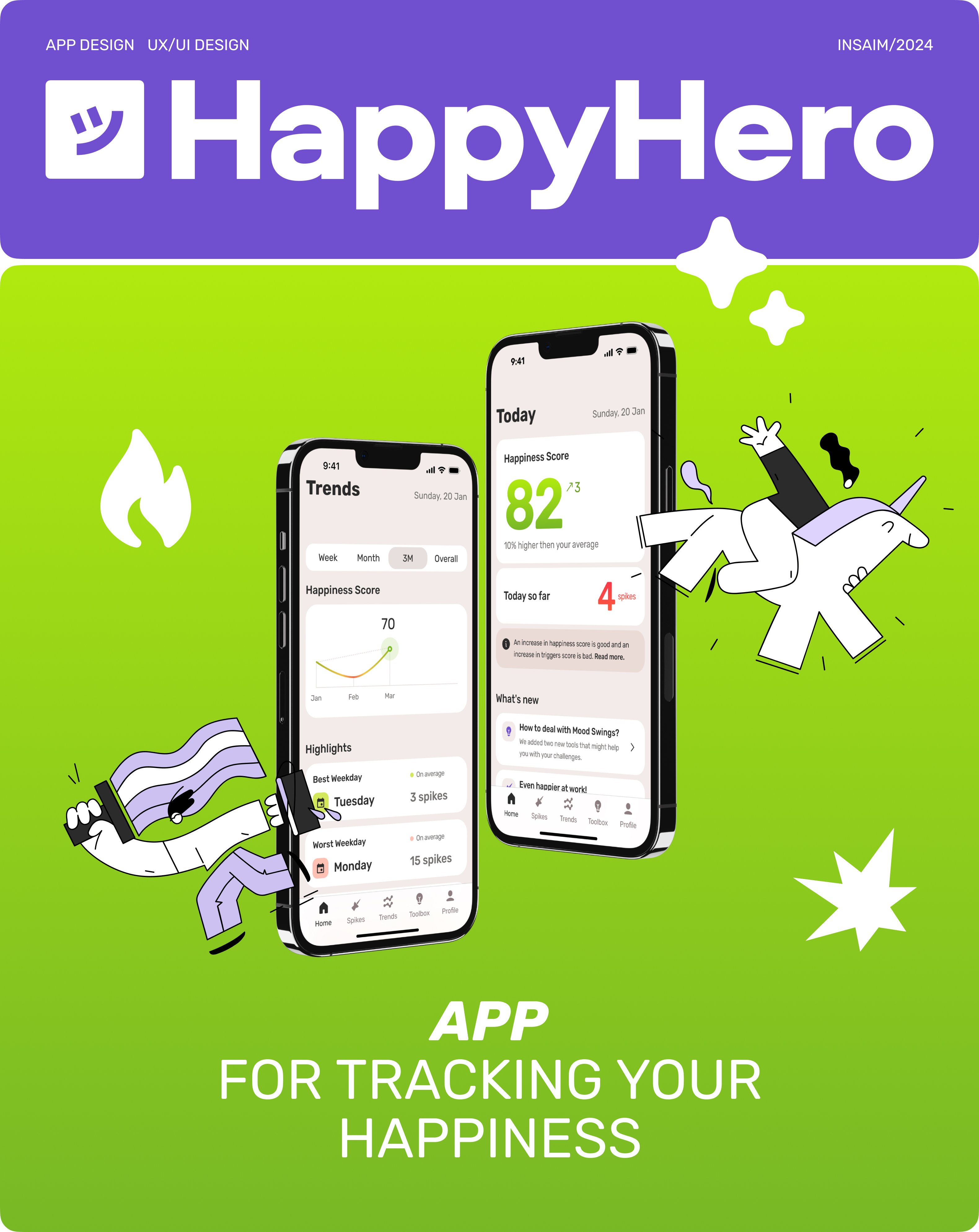 Создали UX/UI дизайн для мобильного приложения Happy Hero — стартапа, который помогает пользователям отслеживать уровень счастья и находить способы его повысить.