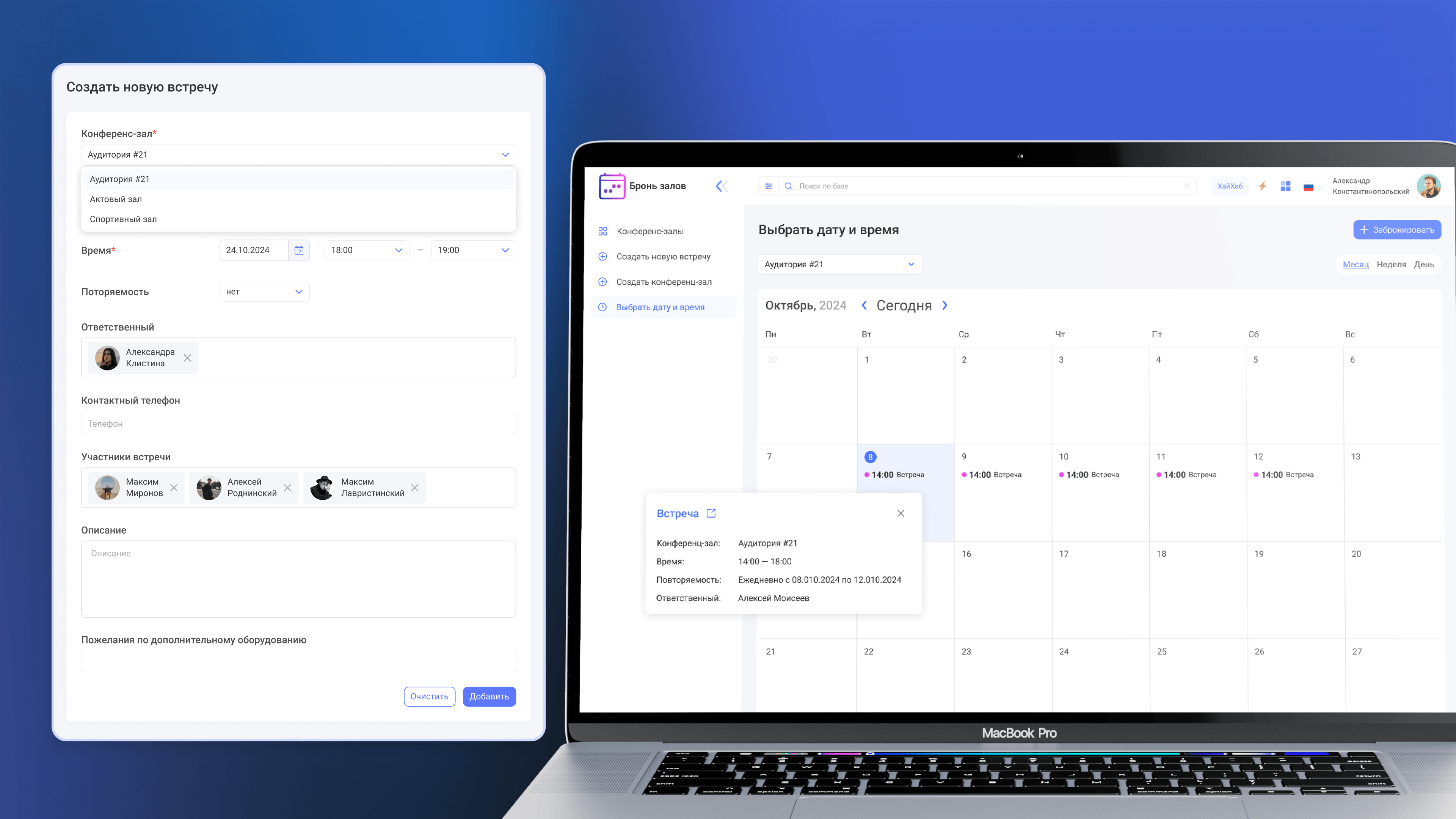 Управление физическим пространством (переговорки и конференц-залы) через ХайХаб минимизирует организационные трения. В модуле можно добавлять новые залы с указанием вместимости и имеющегося оборудования. К каждому залу привязан свой календарь, что позволяет избежать накладок при бронировании.