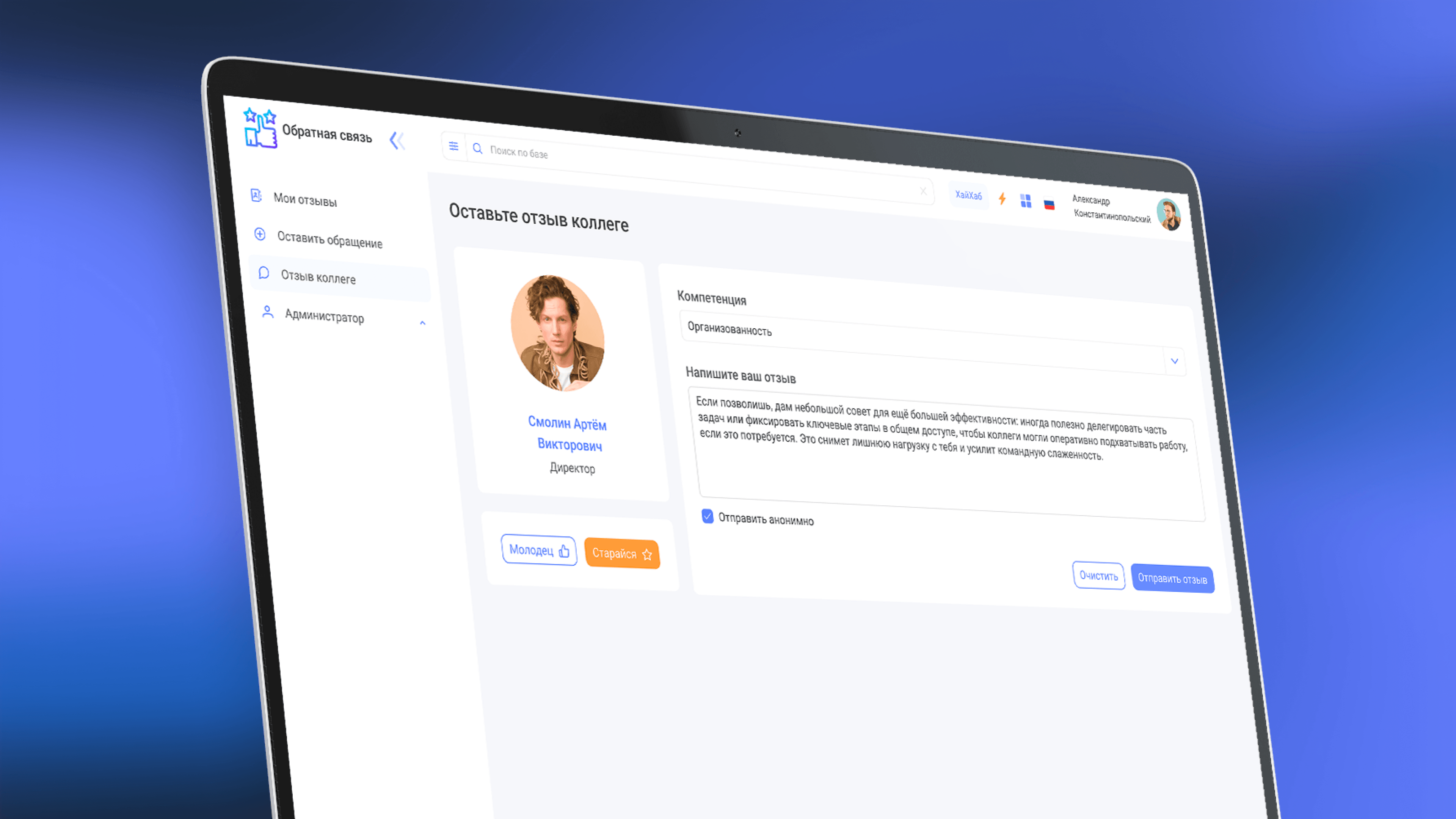Инструмент мониторинга «температуры» в коллективе. Возможность поделиться обратной связью о коллеге (в том числе анонимной) позволяет своевременно выявлять очаги выгорания или потенциальные конфликты. Помимо этого сотрудники могут поощрять друг друга и выражать благодарности. Как позитивный, так и негативный фидбек помогает поддерживать атмосферу открытости в коллективе.