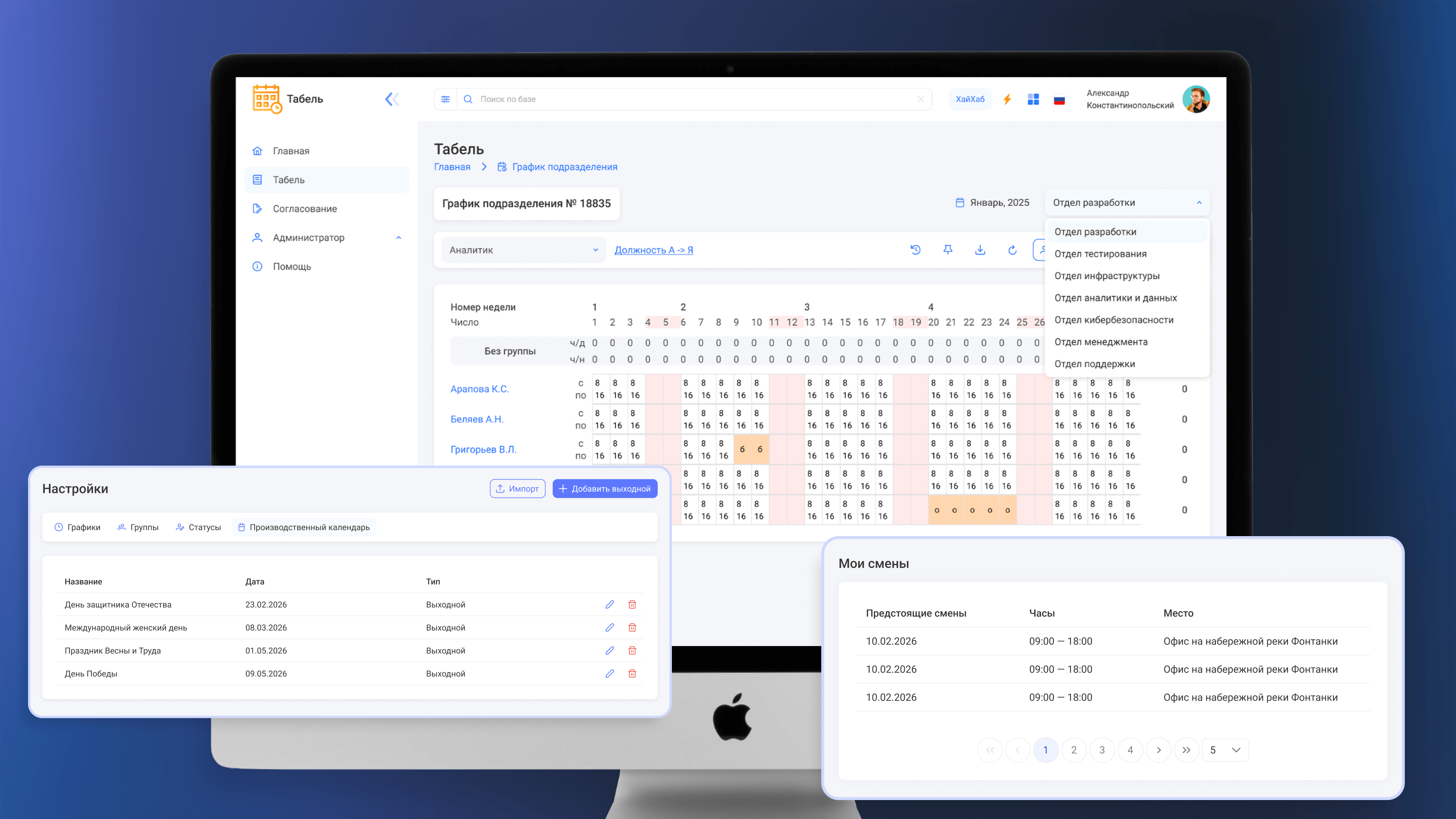 Автоматизированная система мониторинга присутствия и графиков работы позволяет планировать ресурсы без перекосов в нагрузке, отмечать праздничные дни, индивидуальные графики с разбивкой по филиалам.