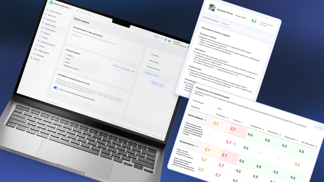 AI-отчёты: по итогам оценки нейросеть анализирует результаты и формирует отчёты, подсвечивает паттерны поведения сотрудника и выдает объективное резюме, исключая предвзятость. Стандартный отчёт включает в себя информацию о сильных сторонах сотрудника, зонах роста и слепых зонах, которым следует уделить внимание. Итогом являются общие рекомендации для сотрудника.