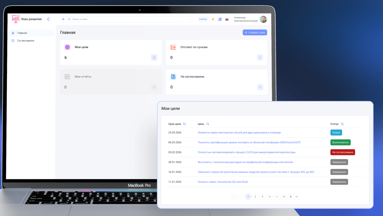 Связующее звено между амбициями сотрудника и целями компании. При помощи Оценки формируется индивидуальный план развития: назначаются статьи из Базы знаний, книги из корпоративной Библиотеки, обучающие курсы. План развития представляет собой интерактивный трекер, где цели декомпозируются на конкретные шаги, подцели, курсы и проекты. По итогам работы с планом развития сотрудник может вырасти в компетенциях и открыть карьерные перспективы, а компания растит профессионалов.
