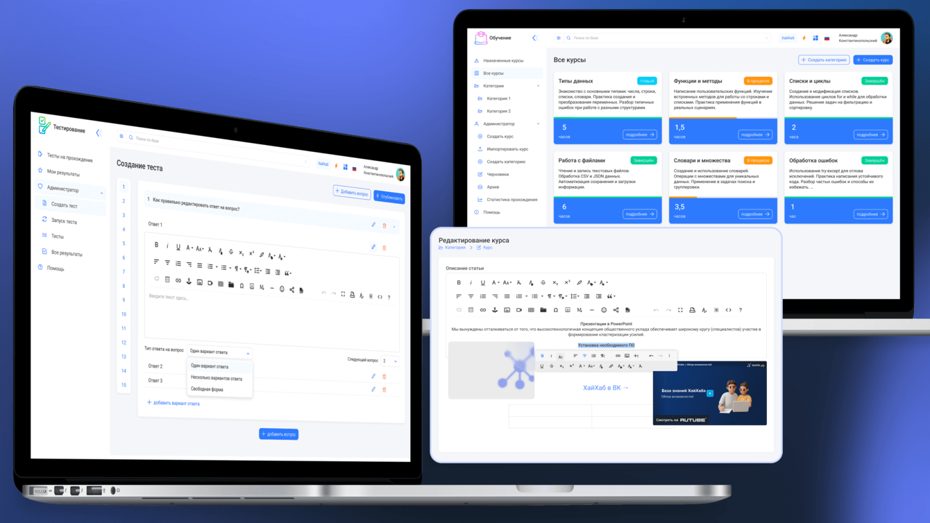 Сервисы «Обучение» и «Тестирование» дополняют друг друга и эффективно работают в связке, но могут использоваться и по отдельности. Модуль обучения поддерживает видеоконтент, позволяет загружать готовые курсы или создавать свои в современный редактор с возможностью добавлять интерактивные вставки. Модуль Тестирование в свою очередь помогает определить уровень знаний сотрудников в динамике, оценить, усвоен ли материал курса. Тесты можно создавать с нуля, менять структуру, создавать открытые вопросы с возможность развернутого ответа или с вариантами ответа и возможностью выбрать один или несколько верных.