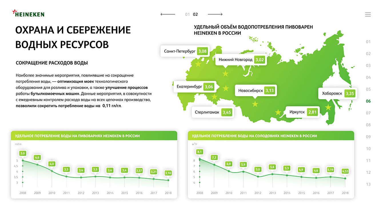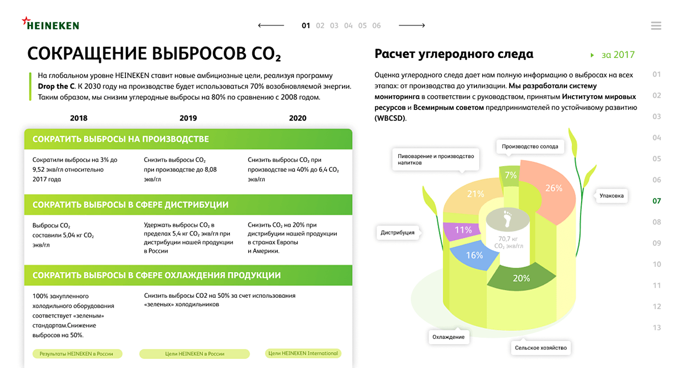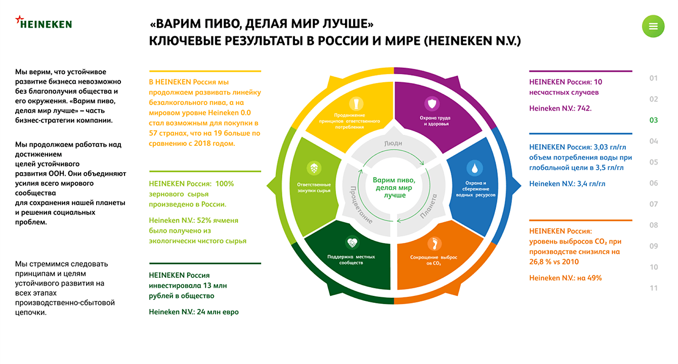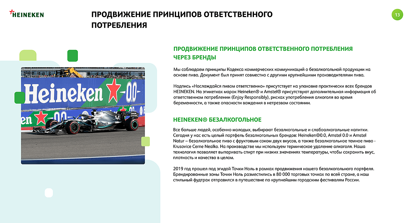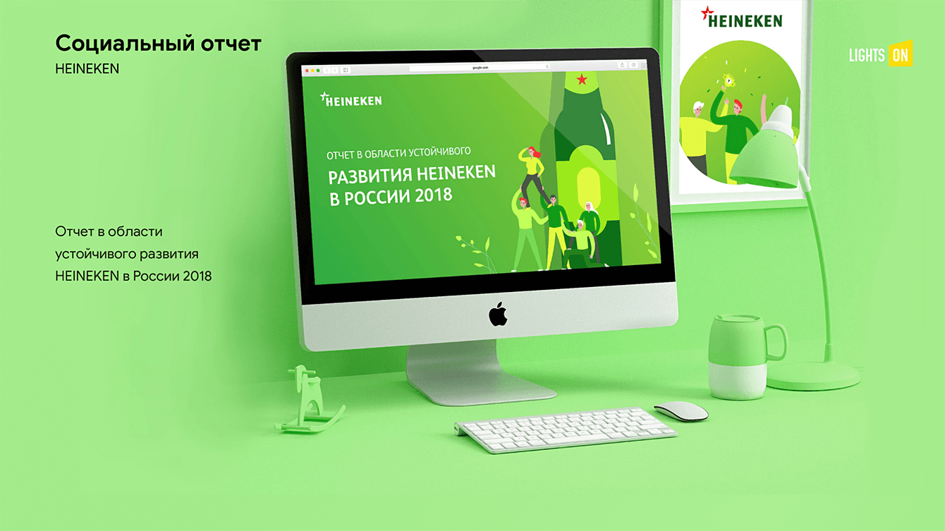Компания HEINEKEN ежегодно выпускает социальный отчет и отчет по устойчивому развитию, для которого необходимо разработать дизайн с учетом фирменного стиля заказчика и упаковать в PDF презентацию.