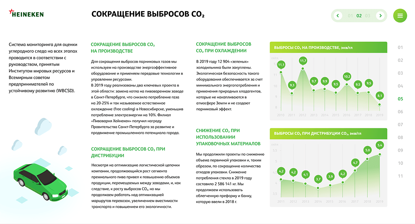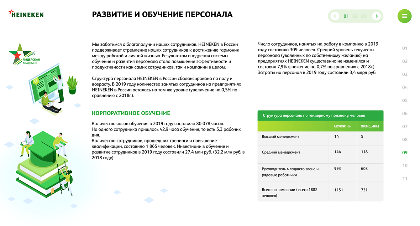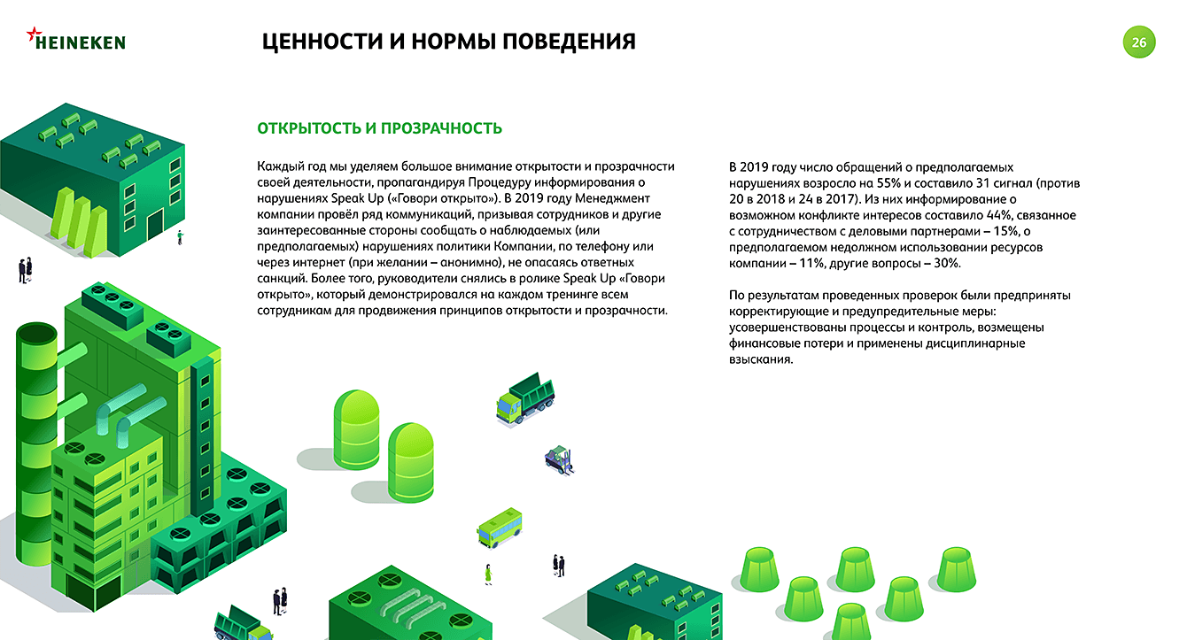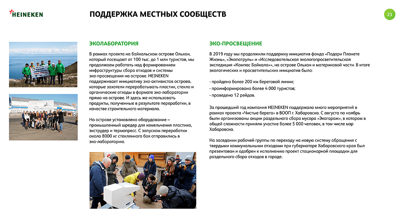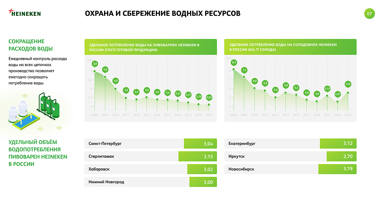 Компания HEINEKEN ежегодно выпускает социальный отчет и отчет по устойчивому развитию, для которого необходимо разработать дизайн с учетом фирменного стиля заказчика и упаковать в PDF презентацию.