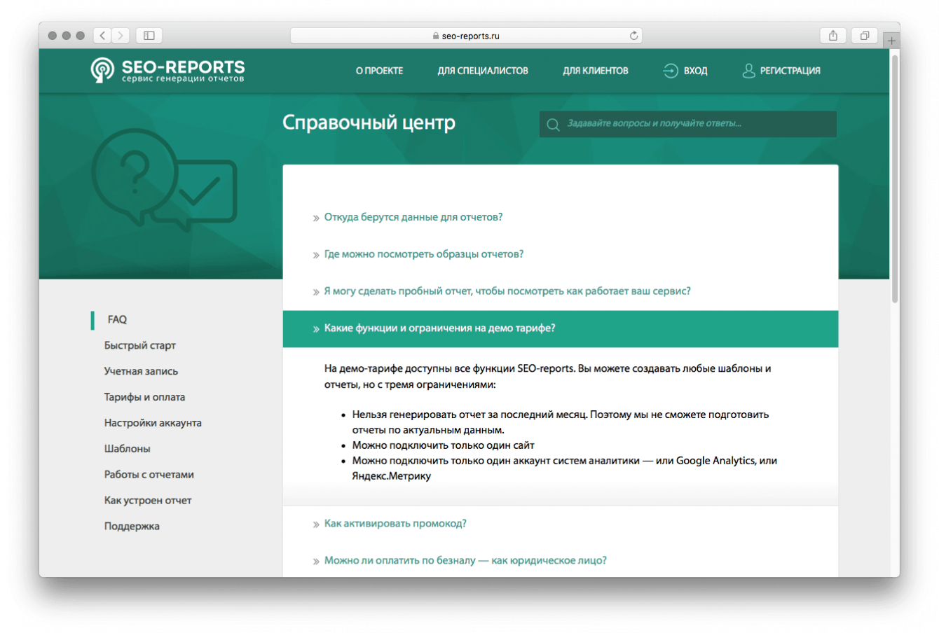 Создали Help и FAQ для сервиса SEO-reports, чтобы снизить нагрузку на отдел техподдержки. Спроектировали структуру, собрали частые вопросы пользователей, написали инструкции, сделали скриншоты.