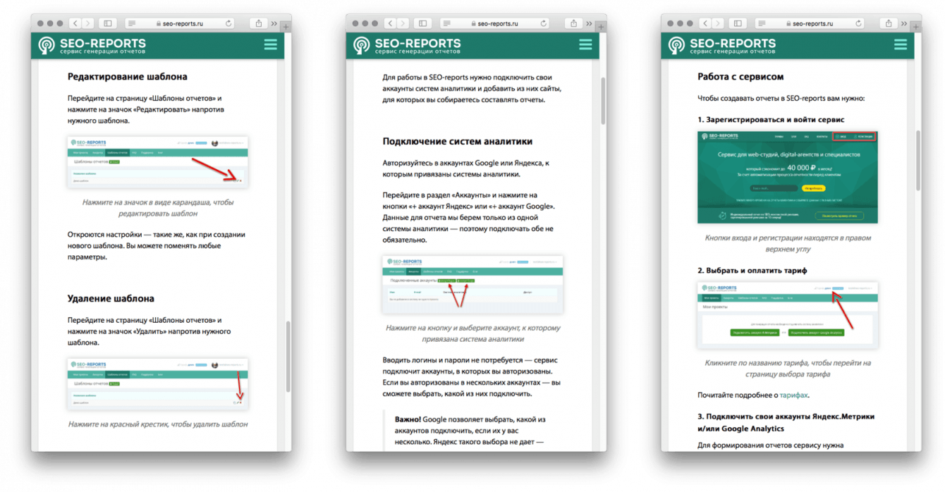 Чтобы написать руководства, надо изучить и понять все функции сервиса. Поэтому первую неделю мы только работали в SEO-reports — создавали отчеты, настраивали шаблоны, подключали и отключали аккаунты в системах аналитики. Заодно отмечали все моменты, где у кого-то из команды возникали трудности.