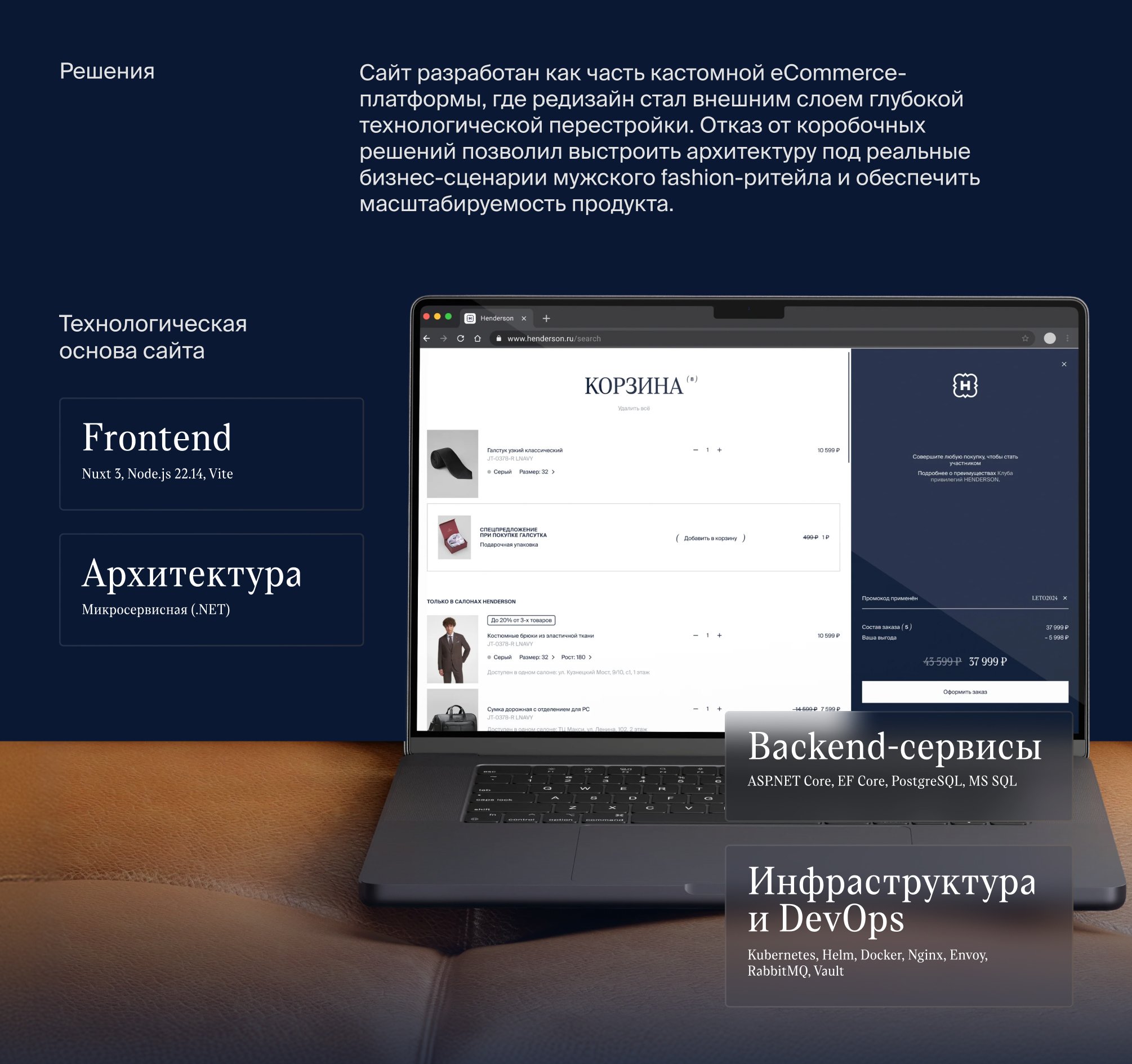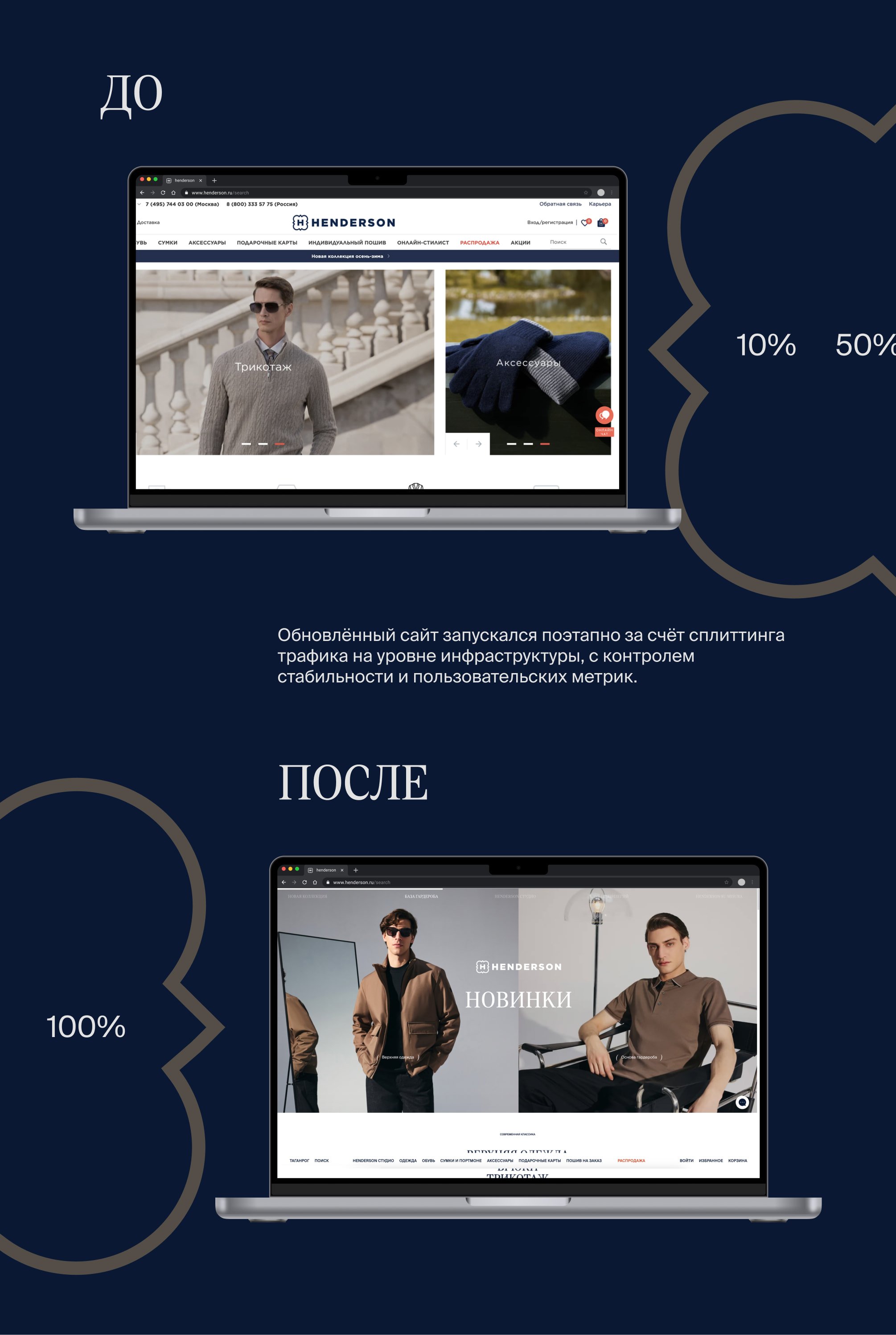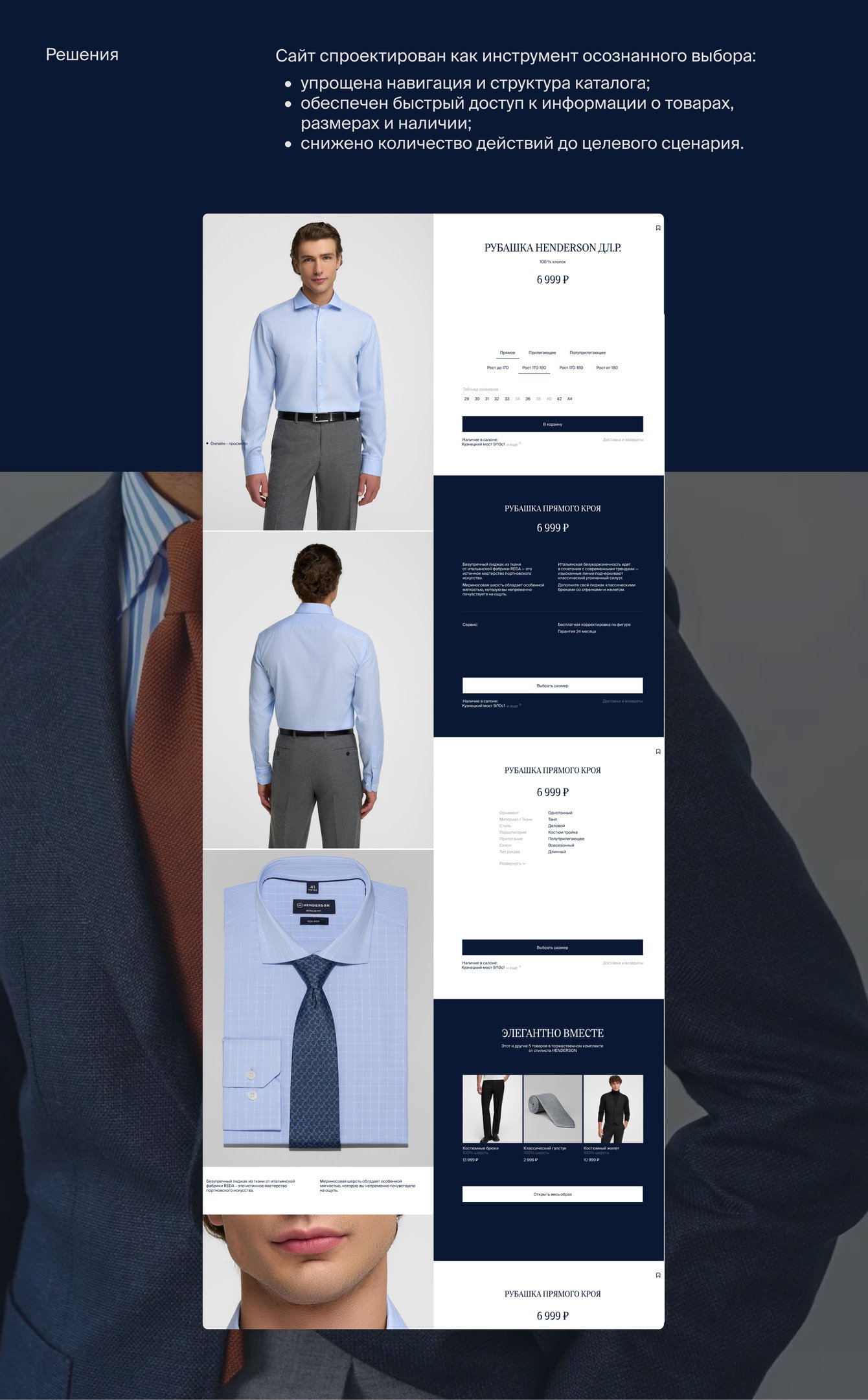 Сайт HENDERSON — ключевая цифровая витрина бренда в сегменте мужского fashion-ритейла, где пользователь ожидает рациональный и предсказуемый сценарий: быстро сориентироваться в ассортименте, понять наличие и размеры, получить прозрачные условия покупки и выбрать удобный путь — онлайн или с продолжением в офлайн-салоне.