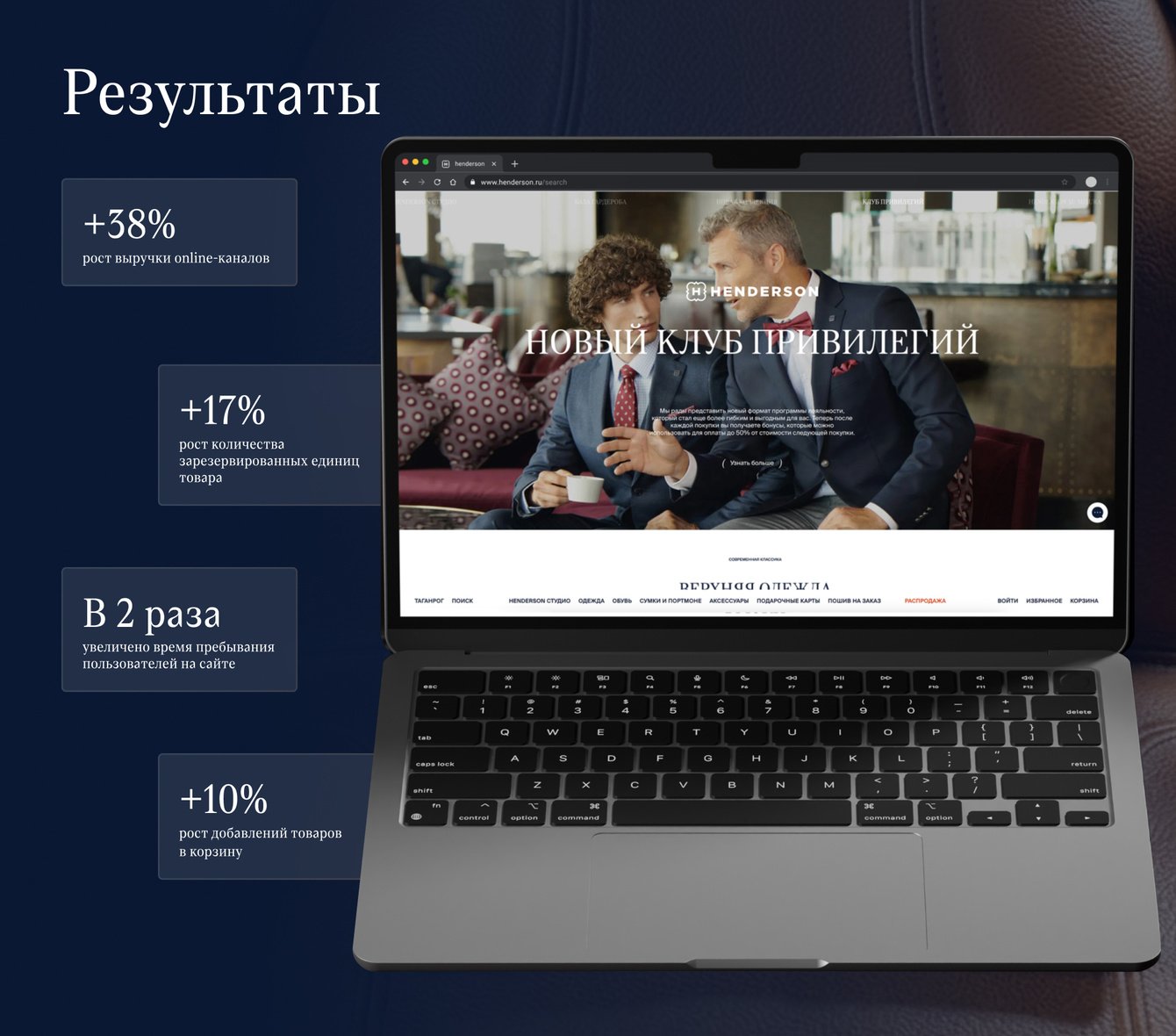 Проект стал примером системной eCom-трансформации в сегменте мужского fashion-ритейла, где сайт выступает не просто цифровой витриной, а так же ключевым продуктом для принятия решения, объединяющим онлайн- и офлайн-каналы и обеспечивающим измеримый рост бизнес-метрик.