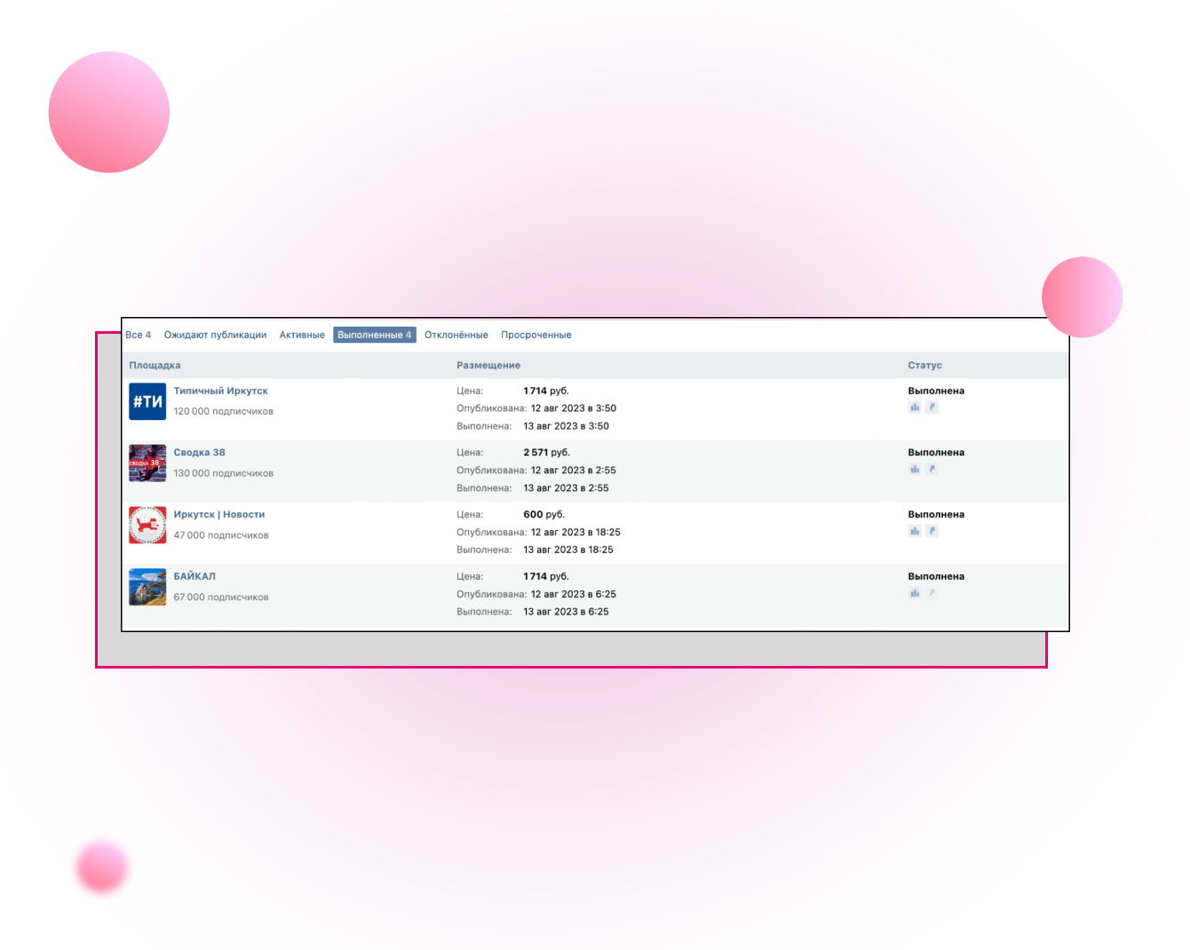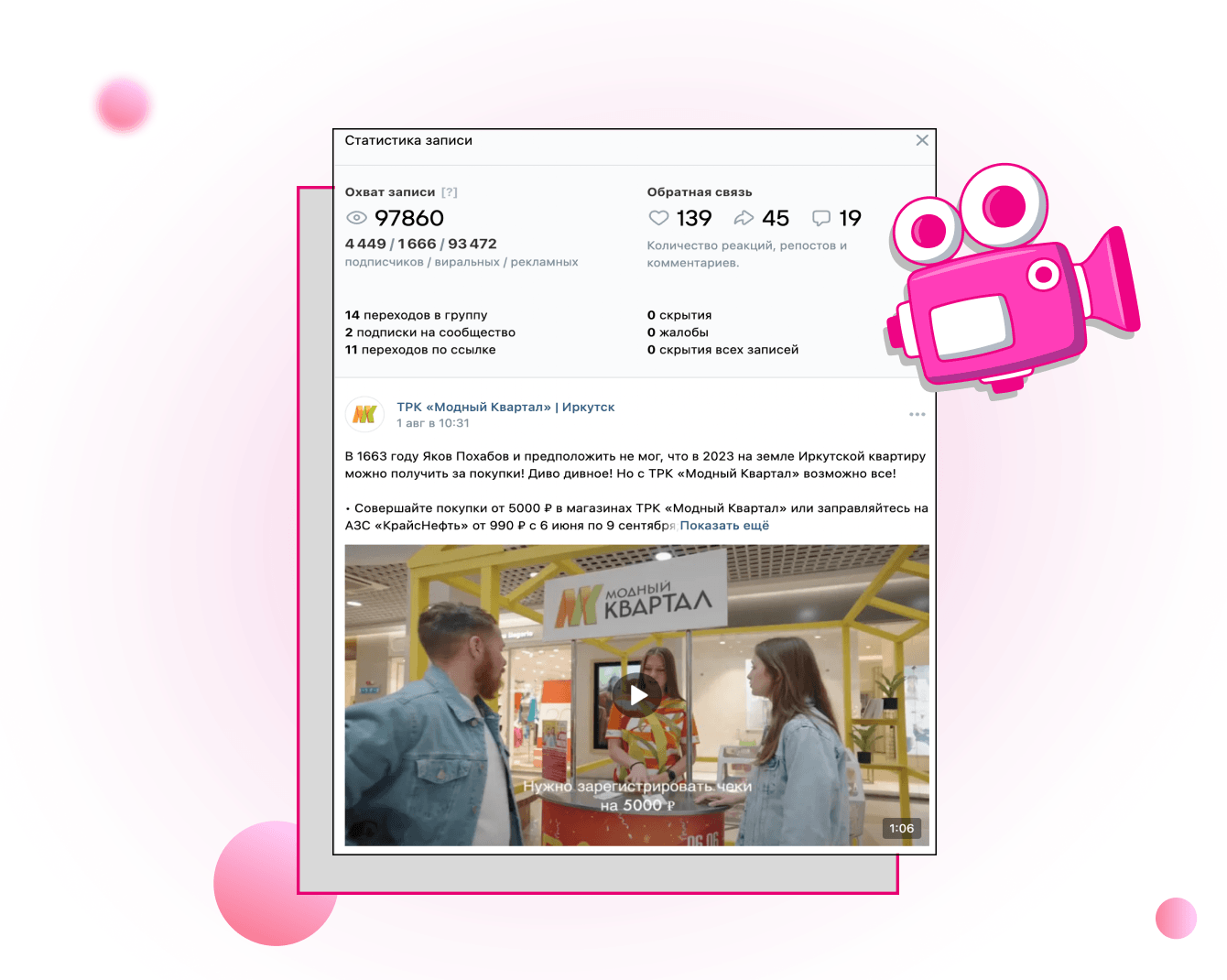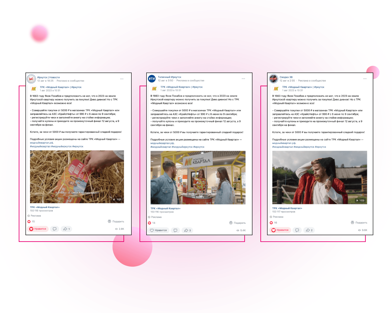 Информационную кампанию мы начали с анонсов даты финала акции в соцсетях и посевов в популярных городских сообществах Иркутска. Для этого воспользовались маркет-платформой ВК.