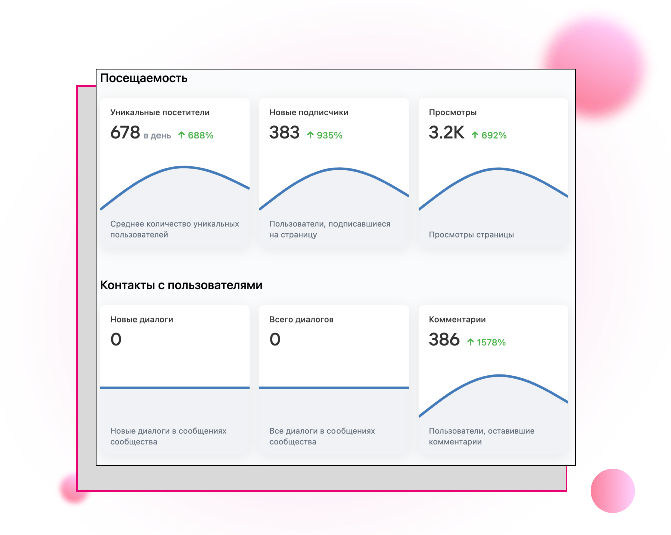 За день в группе зафиксировано 678 уникальных пользователей. На сообщество подписалось 383 человека. А комментарии увеличились на 1578% - 386 шт.