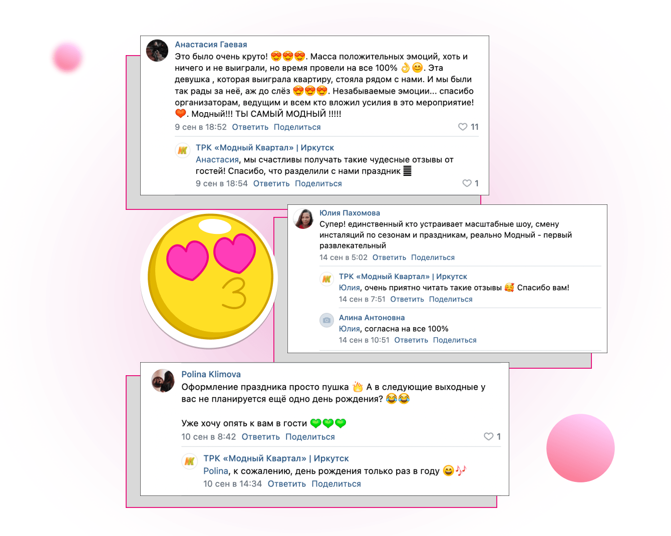 В итоге были выполнены все поставленные задачи, результат которых мы видели не только на объекте в лице гостей праздника, они также отразились в статистике сообщества ТРК «Модный Квартал». Гости получили от мероприятия огромное удовольствие и оставляли обратную связь на страницах комплекса.