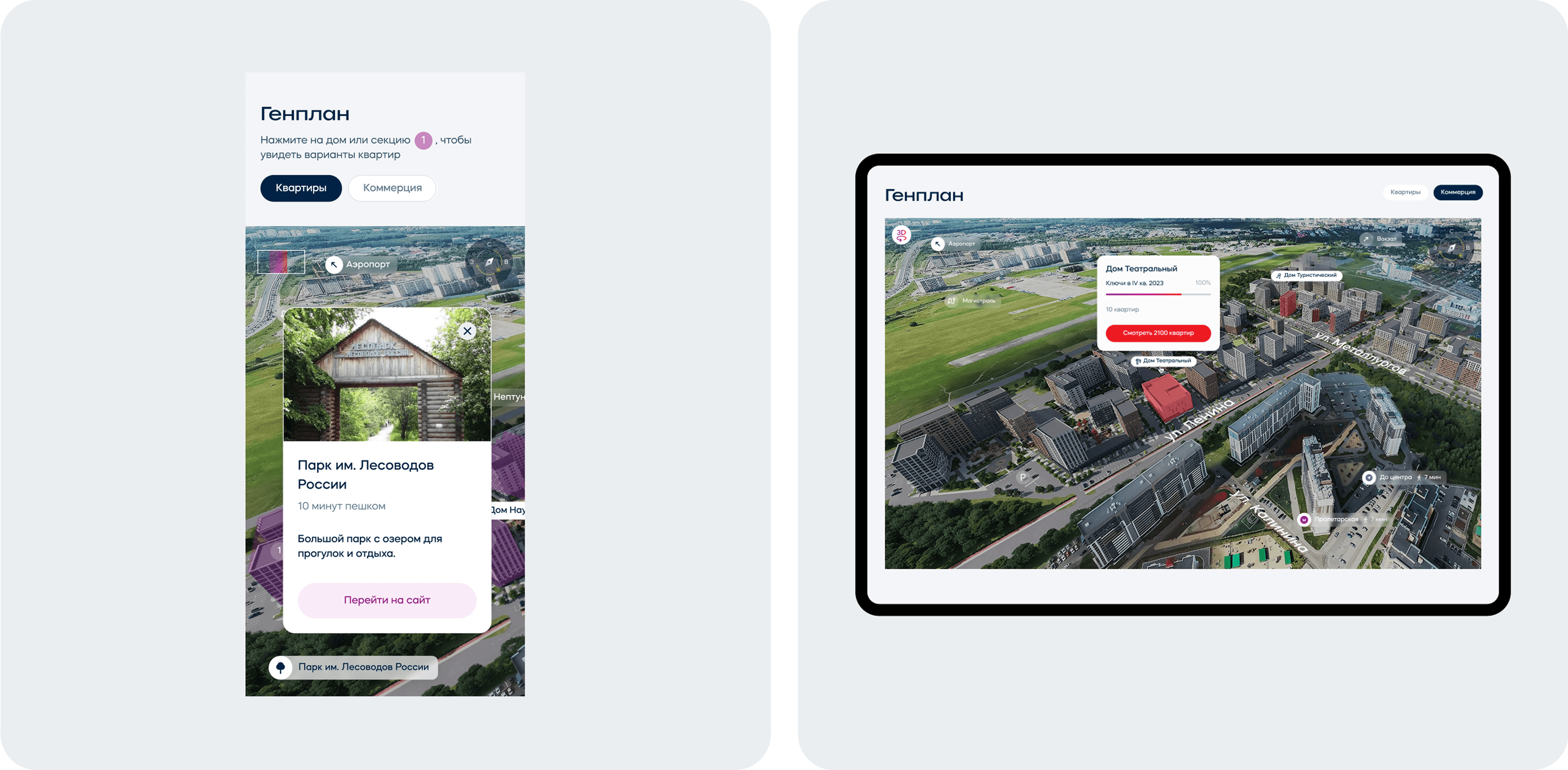 Для простоты восприятия информации мы реализовали интерактивную карту генерального плана с акцентом на ключевые объекты.
