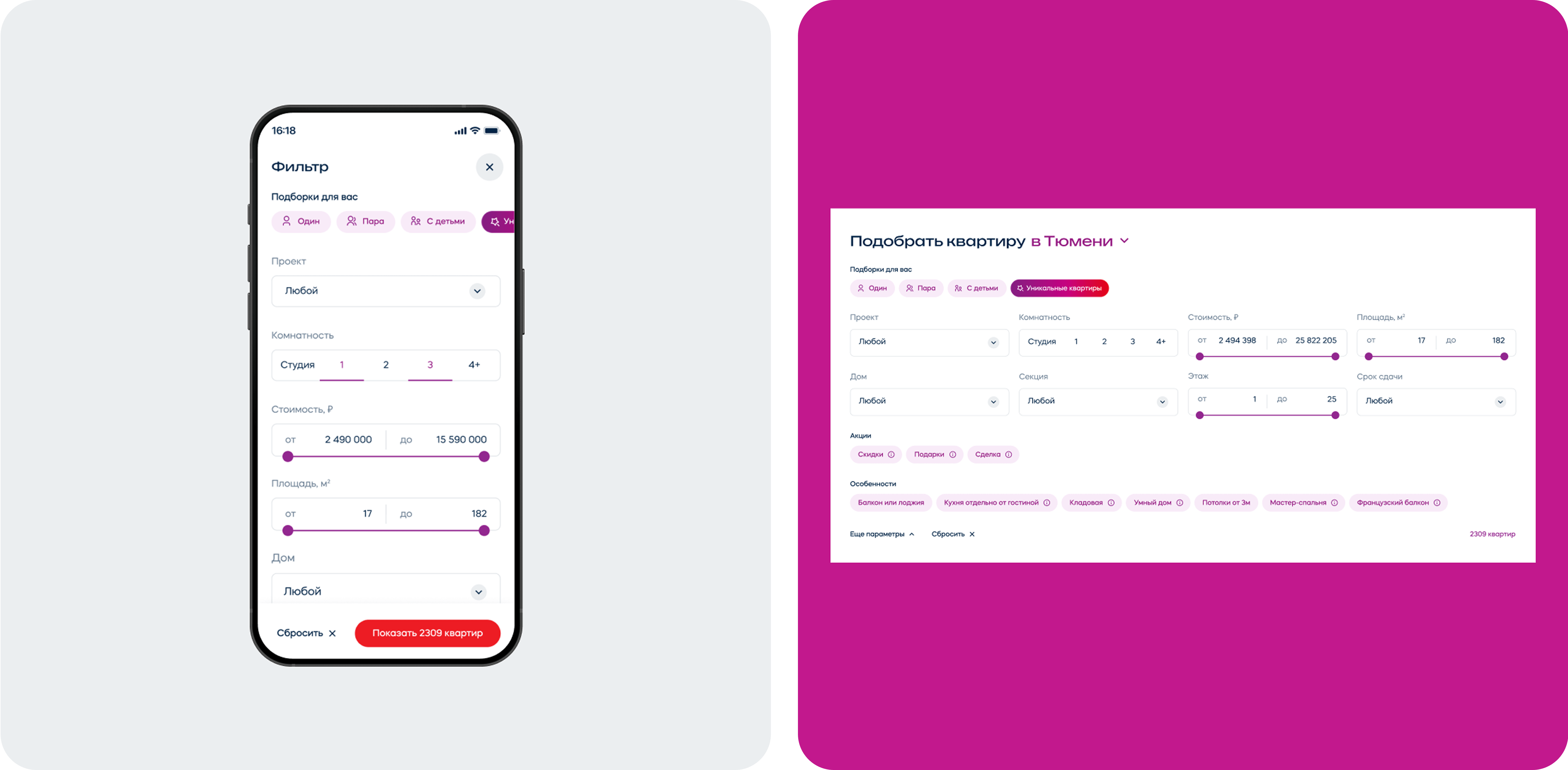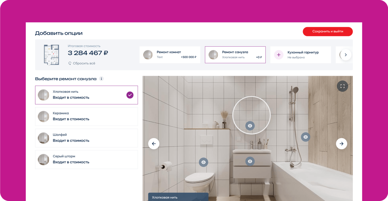 Каждый вариант включает множество опций и планировок. А система автоматически считает стоимость и обновляет данные в реальном времени.